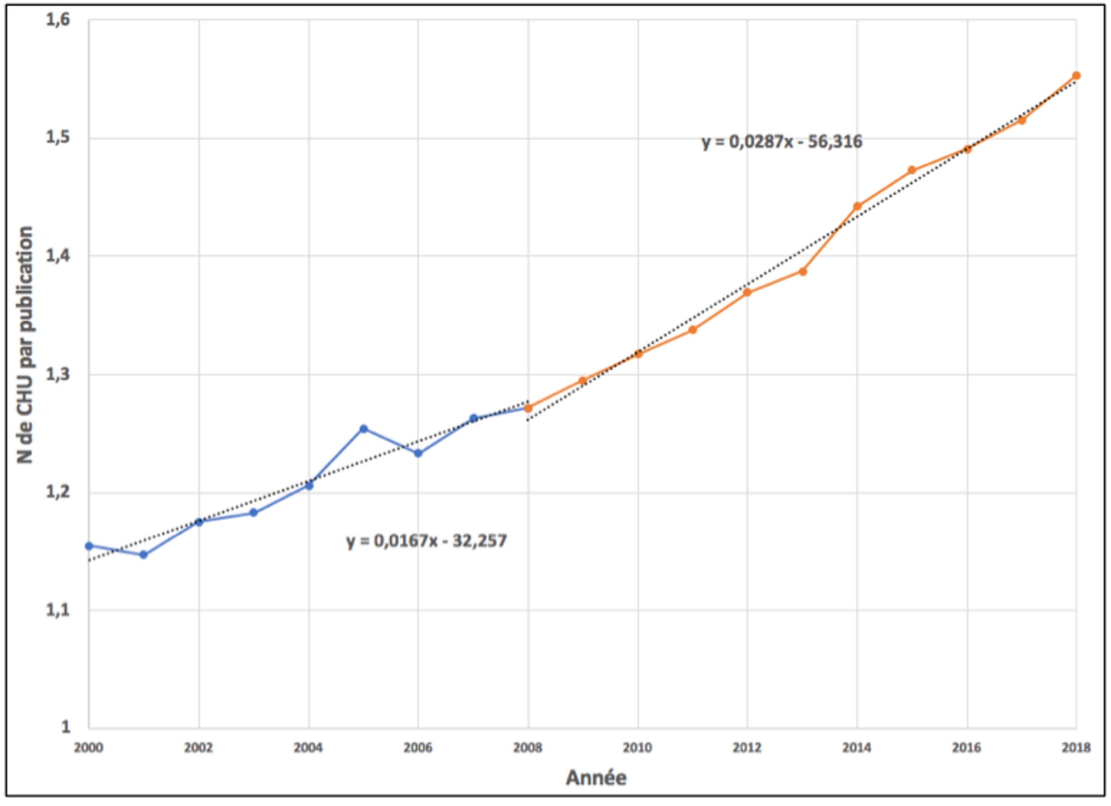 Les collaborations entre CHU n’ont pas cessé elles aussi d’augmenter depuis la mise en place du système. Cela est confirmé par l’évolution du nombre moyen de signatures d’établissements par publication, qui est passé de 1.15 à 1.55 entre 2000 et 2018. La Figure 2 montre bien que le taux de collaborations entre CHU s’est accéléré vers 2006, année du début de l’implantation de SIGAPS.