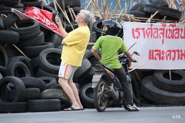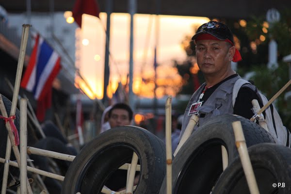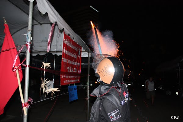 Cinq minutes déjà. Personne ne sait, ou ne voit, si l’armée va tenter un assaut. Tout à coup, une bombe explose, dans un bruit assourdissant qui ajoute un degré de tension. L’onde de choc déclenche l’alarme d’une voiture. Un rouge, casque de construction sur la tête, et protégé par un manifestant armé d’un bouclier de la police, réussit à toucher un immeuble à près de deux cents mètres avec sa fusée. Cette riposte est vécue comme une victoire, un acte incitant à continuer, à ne rien lâcher. Plus encore, à se sacrifier. Comme le prône le leader Jatuporn Prompan qui assure « qu’ils se battron(t) contre des blindés et des armes automatiques » à mains nues. Pourtant, les visages marqués par le stress, la désorganisation des troupes, la tactique de l’armée qui reste tapie dans l’ombre… semblent prouver en quelque sorte que les manifestants sont plus vulnérables qu’il n’y parait.
