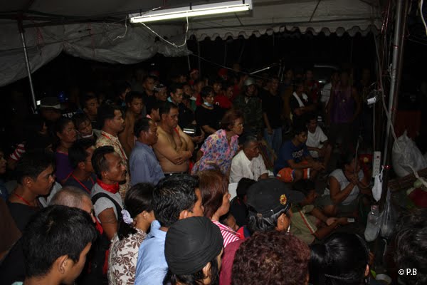 19h50. Après quatre grosses explosions assourdissantes qui font grimper le rythme cardiaque des « encerclés », un peu comme l’écho des tirs de fusil résonnent dont on ne sait trop où, le silence de l’attente, de l’inquiétude, laisse place au retour à la normale, malgré une obscurité inquiétante. Des rouges se promènent maintenant debout, d’autres se remettent à manger... « C’est fini. Ils ne veulent pas attaquer. L’armée ne cherche qu’à tuer nos leaders. Et ce soir, ils ont réussi à toucher le général », assure Ting, cet homme d’une quarantaine d’années, originaire de Chonburi, au torse nu et tatoué, à la peau mate, propre à une majorité des manifestants qui s’oppose au teint blanc des élites de Bangkok, accusés de mépriser le reste de la Thaïlande. À ses yeux, les leaders sont presque plus importants que ses revendications. Alors son visage perd évidemment de sa gravité à l’annonce de la bonne nouvelle : le général Seh Daeng est sérieusement touché, mais vivant, et il serait en train de subir une opération chirurgicale à l’hôpital Hua Chiew.