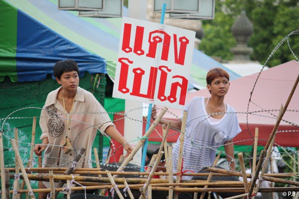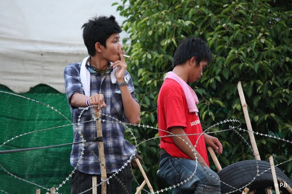 Parmi les Rouges, se trouvent aussi de nombreuses femmes, des personnes âgées, et des adolescents, à l’image de ces deux jeunes trônant sur les barricades de bambou, pneus, et barbelés.