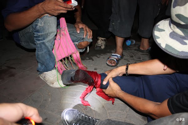 Un des Rouges tient son pied blessé lors d’une explosion, dont l’origine reste inconnue. Est-ce l’armée ou les manifestants ? Personne ne pouvait donner de réponses.