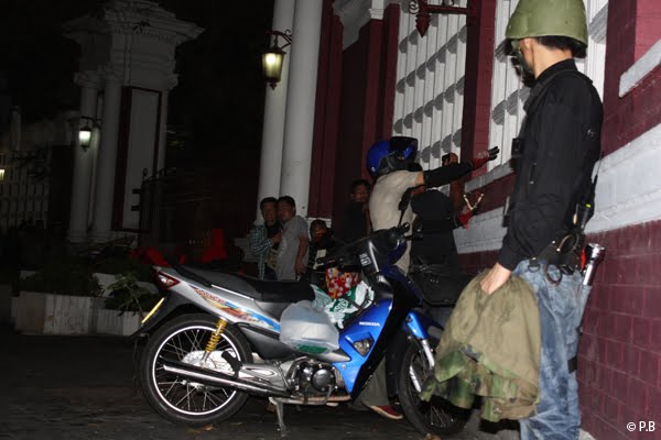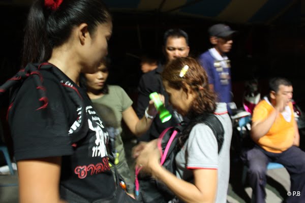 À la sortie, l’équipe de la sécurité, composée d’hommes et de nombreuses femmes, s’est renforcée. Maintenant, toute personne pénétrant dans le site est systématiquement fouillée. À l’extérieur, les taxis et les moto-taxis ne chôment pas. Une file d’attente s’est formée pour quitter les lieux. Tout semble indiquer que la soirée est finie, et qu’un retour à la maison s’impose. Pourtant, à deux minutes de là, près de deux cents manifestants, enflammés, se mettent à lancer des pavés sur des soldats qui se trouvent derrière les grilles du parc Lumpini, sous le regard d’un militaire impassible, dépassé, et bientôt chassé. Une pierre, deux pierres, puis tout s’accélère : elles fusent ensuite de toutes parts. La tension monte. Des balles en caoutchouc sifflent en direction des protestataires. L’un d’eux est touché. On s’occupe de lui dans les secondes qui suivent. Il n’a qu’un hématome à l’épaule, qu’il exhibe aux caméras et aux photographes.