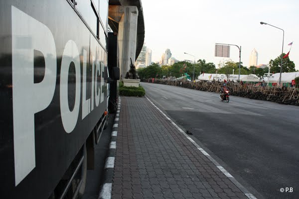 L’armée avait annoncé son scénario. Et planté le décor : ce soir, sur le coup 18 heures, un déploiement de 32 000 hommes et plus de 150 véhicules blindés doivent quadriller la « forteresse » des chemises rouges. Sur place, un calme trompeur plane. Comme pour mieux annoncer la tempête. Pas de militaires visibles, aucun char de l’armée à l’horizon. À leur place, le trafic habituel sur Silom et une bonne vingtaine de journalistes et de photographes, équipés de casques et brassards verts marqués de l’inscription « Press », remplissent le tableau bien vide de ces rues désertes, encerclées par les barricades de bambou, de pneus, et de barbelés tranchants. Le tout, illuminé par un soleil déclinant, doucement chassé par la nuit.
