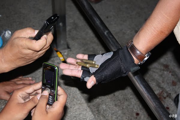 L’un des fameux « Hommes en noir », ces combattants ressemblant plutôt à d’anciens militaires qu’à des paysans de l’Isan, montre les douilles des balles tirées en direction du général Seh Daeng.