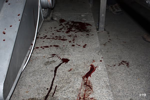 A l’entrée de la station MRT du métro de Silom, le sang du général Seh Daeng, touché à la tête par un sniper vers 19h25, témoigne de la violence de l’impact des balles.