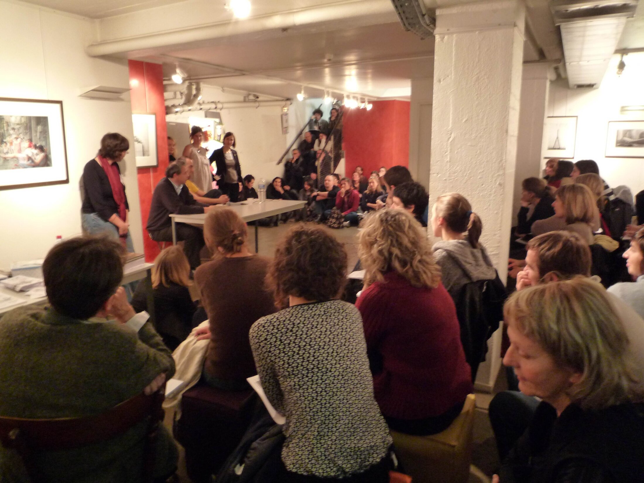 Il y a un petit comité de lecture, composé des trois filles qui animent aujourd'hui l'association (Marine Jubin, Delphine Lizot, Stéphanie Perrin). Nous nous fondons sur nos goûts personnels, bien sûr, mais aussi sur les conseils des adhérents et sur ceux des auteurs que nous invitons. Ainsi, c'est par Robert Bober, cinéaste et écrivain invité par Les Filles du loir en 2012, que nous sommes entrées en contact avec Georges-Arthur Goldschmidt. Nos rencontres avec les auteurs sont différentes de ce qui se fait d'habitude puisque l'écrivain se trouve devant un public qui a préalablement lu le livre dont il parle, qui est toujours une œuvre publiée il y a quelques années. Il y a donc un échange entre l'auteur et le public, une réflexion commune sur le livre dont il est question (en photo, ci-dessous, la rencontre avec Grégoire Bouillier).