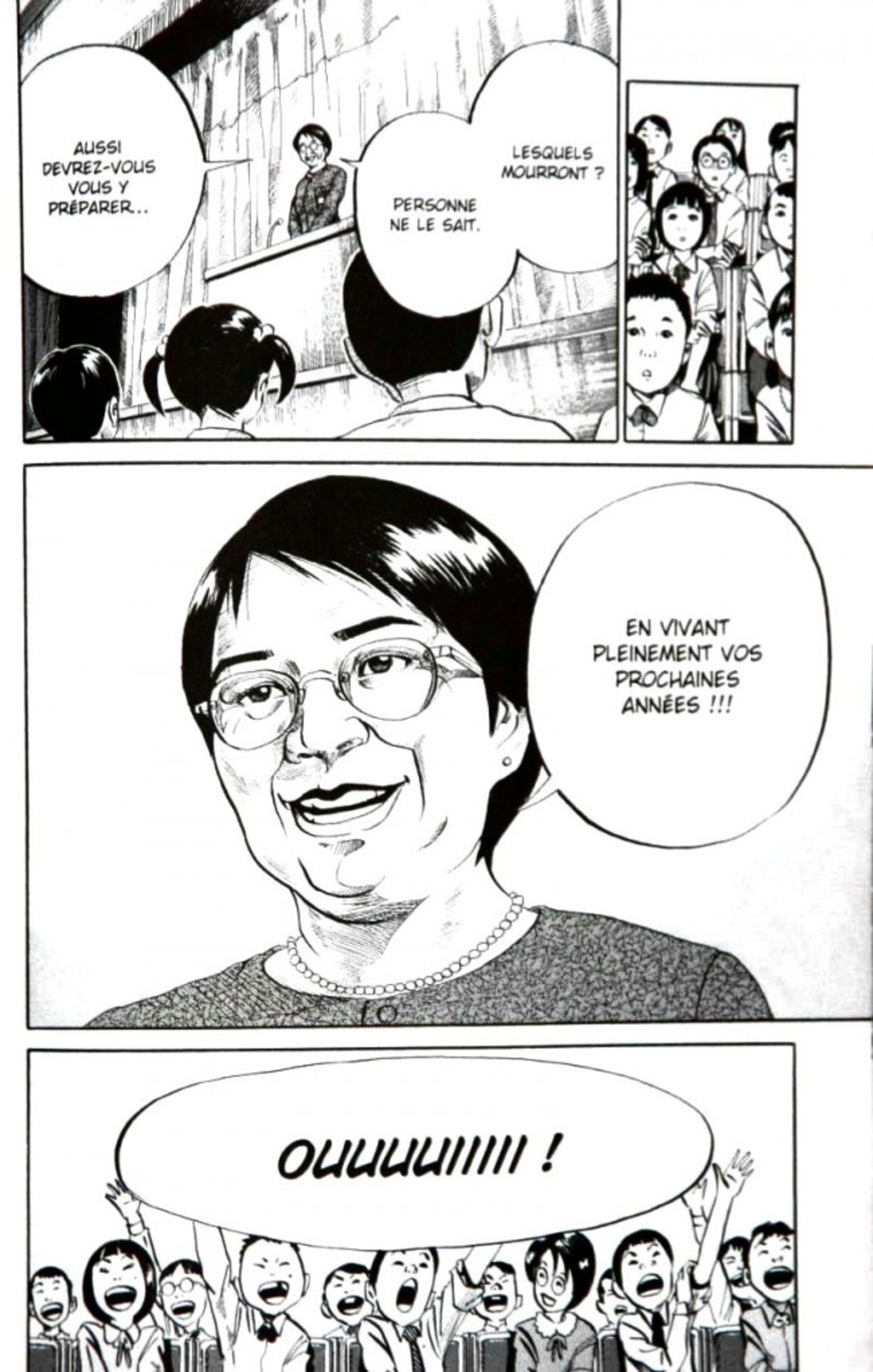 Encore une fois, c'est par le prisme de l'expérience intime que passe Motoro Mase pour exploiter son idée. On suivra donc les derniers jours de nombre de ces malheureux gagnants à la loterie de la mort. Même si les réactions sont variables, on sent l'histoire glisser inéluctablement vers la prise de conscience de Kengo Fujimoto, personnage principal chargé de délivrer le fameux Ikigami, en quelque sorte l'avis de décès anthume (Allais, quand tu nous tiens) des condamnés, qui par une belle ironie ont droit à de nombreux services gratuitement pour leur dernières heures.