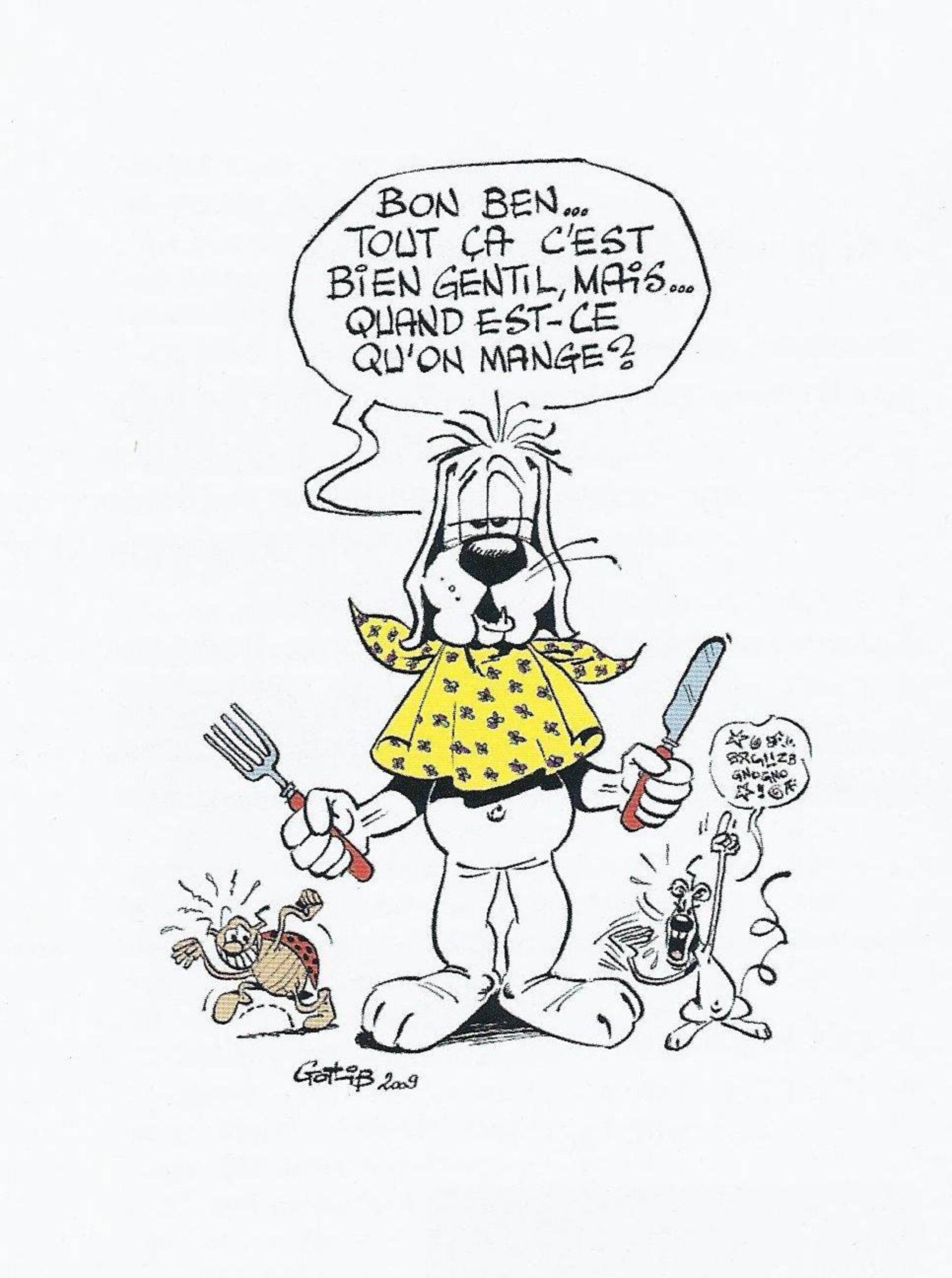 L’objet livre vaut à lui seul le détour : il se déploie, se déplie, se démultiplie : la nouvelle de Douglas Kennedy, Un Dîner aux chandelles est reproduite en anglais dans le livre, elle figure sous forme de livret détachable, en français, en fin de volume, le remix de Bob Sinclar est sous pochette à l’entrée du livre, un Guide du respect filles-garçons par l’association Ni putes ni soumises se glisse entre deux pages. On croise Casimir et des 2 CV, Pif le Chien et des Solex, des cadeaux Bonus et même des disquettes. Un voyage dans le temps, documenté, sociologique, nostalgique sans passéisme. Et laissons le mot de la faim à Gotlib dont les dessins ponctuent le volume :