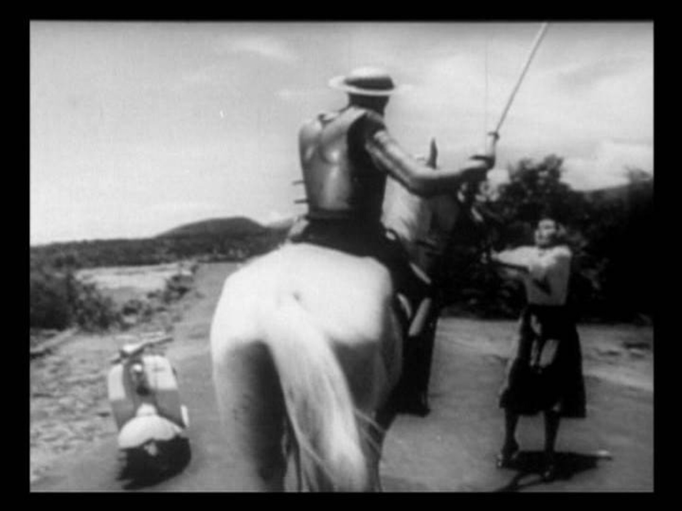 C’est de cette logique de la répétition et de la dissémination dont il serait question dans le Quichotte de Cervantès. C’est en tout cas ce qu’inviterait à y voir la lecture du livre de Jérôme Game qui répète le livre de Cervantès autant que certains avatars qui, à travers l’Histoire, ont repris celui-ci en l’inscrivant dans d’autres devenirs. On pensera surtout au film inachevé d’Orson Welles, central dans DQ/HK, film dont l’inachèvement, le caractère intrinsèquement défait, décousu, chaotique, serait, paradoxalement, la réalisation nécessaire de la logique fictionnelle du Quichotte. Le livre de Jérôme Game est autant la reprise du double roman de Cervantès que de la doublure exacerbée de ce roman par Orson Welles. Celui-ci s’est consacré à ce film durant 14 ans, sans le terminer, tournant des scènes selon l’occasion, dans des lieux improbables entre Paris, le Mexique, l’Italie, l’Espagne – l’errance du personnage espagnol devenant celle, internationale, de Welles, mais surtout de ce work in progress qu’est le film qui, loin de retrouver l’Espagne de Don Quichotte partout – logique du Même – intensifie l’errance de celui-ci à travers le monde comme à travers le temps, Welles promenant son personnage au XXe siècle, redoublant ainsi la différence du livre avec le monde comme avec lui-même, introduisant dans le monde « actuel » ce personnage sorti du 17e siècle et qui le fait différer de ce qu’il est supposé être et n’a jamais été, le rendant à la dissémination universelle où demeure le film inachevé.