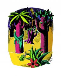 Douze contes, donc, pour admirer l’oiseau de la cascade, connaître l’histoire du peuple des orphelins, du pays appelé L’Écho l’Écho, croiser des animaux qui parlent, des êtres magiques, des humains, s’entendre dire l’histoire du caïman qui voulait qu’on le porte pour le mettre à l’eau, d’un vent qui souffle si fort qu’il a toujours faim et avale tout ce qui se trouve sur son passage, d’un poussin devenu roi.