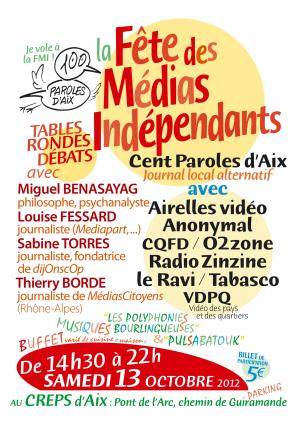 Oyez, citoyens ! Vous êtes tous conviés à la grande Fête des Médias Indépendants en PACA, le 13 octobre 2012, au CREPS d’Aix-en-Provence (1) ! Les animateurs des médias régionaux indépendants ont décidé de sortir de leur isolement, de se rencontrer, de coopérer et de fêter leurs retrouvailles autour d’une grande journée de débats, de réflexion, d’expérimentations et de fête. Car l'apparition et le maintien d'expériences insoumises, dans un environnement qui semblait les exclure, est toujours une fête.