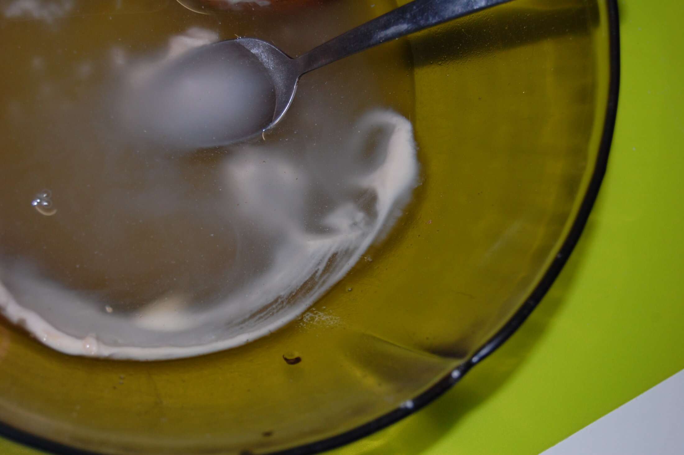 Avec la petite cuillère, écraser la levure contre la paroi du saladier, et tourner tout autour pour aider à ce qu’elle se dissolve.