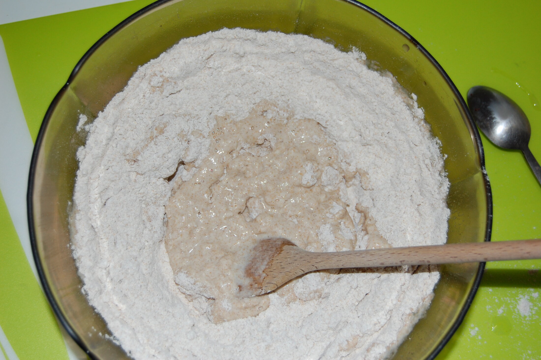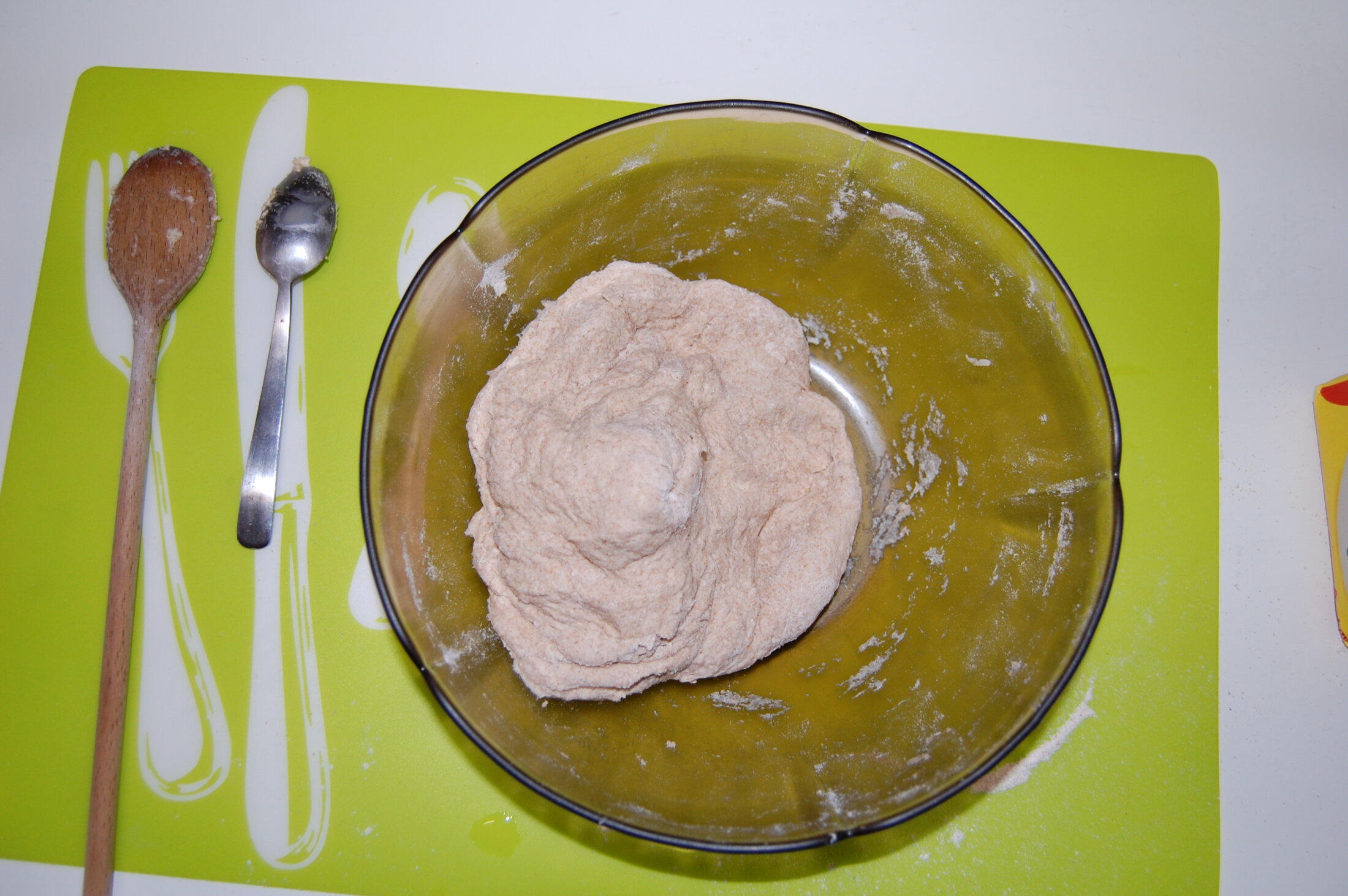 En fait, il vaut mieux ne pas mettre assez de farine, et avoir à en ajouter ensuite. Parce que s’il y a trop de farine, la pâte sera trop épaisse, et le pétrissage deviendra du handy-building. Creuser un trou au centre et aider à ce que l’eau y vienne. Puis tourner, d’abord au milieu, puis en se rapprochant du bord du saladier,
