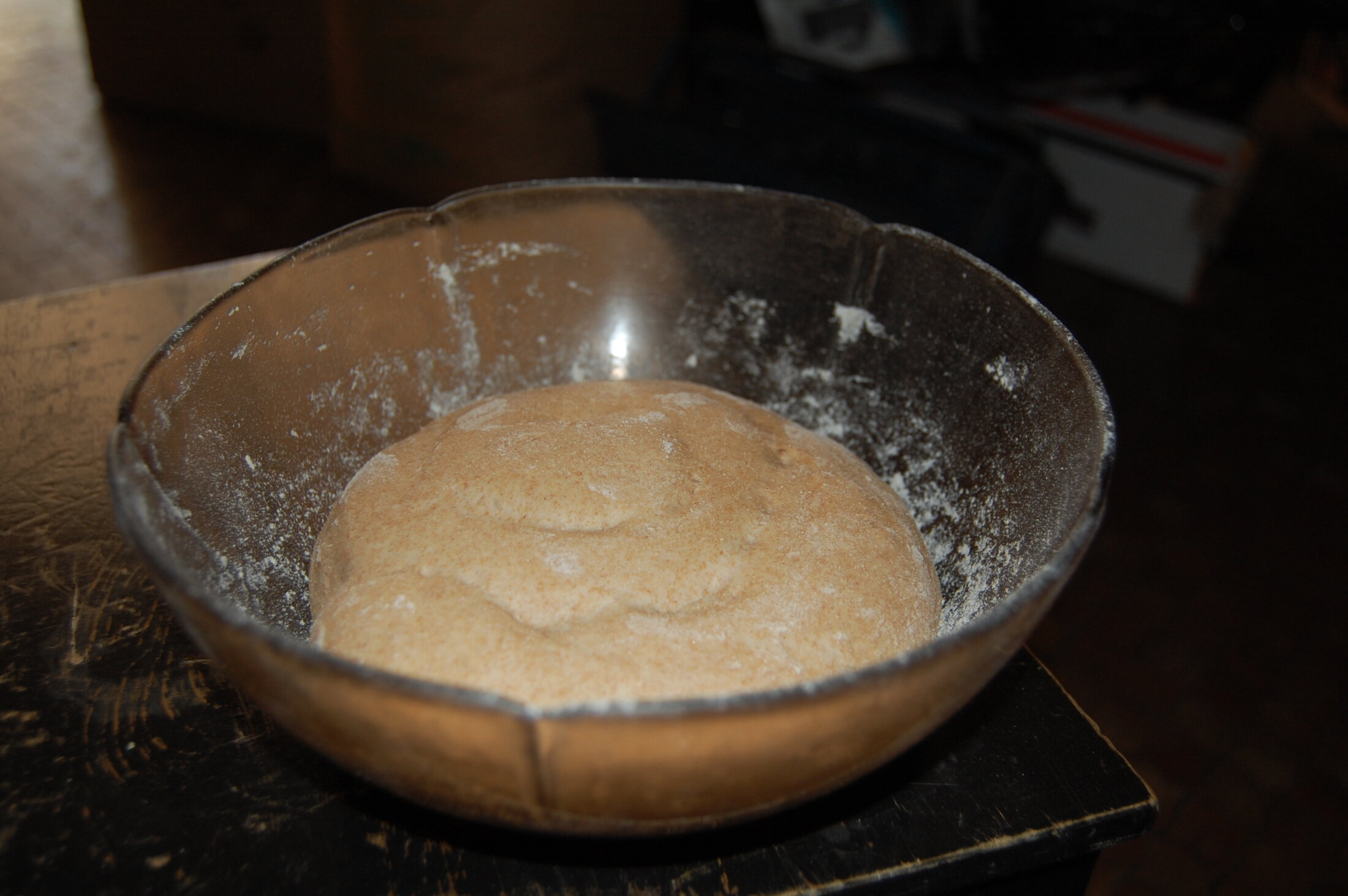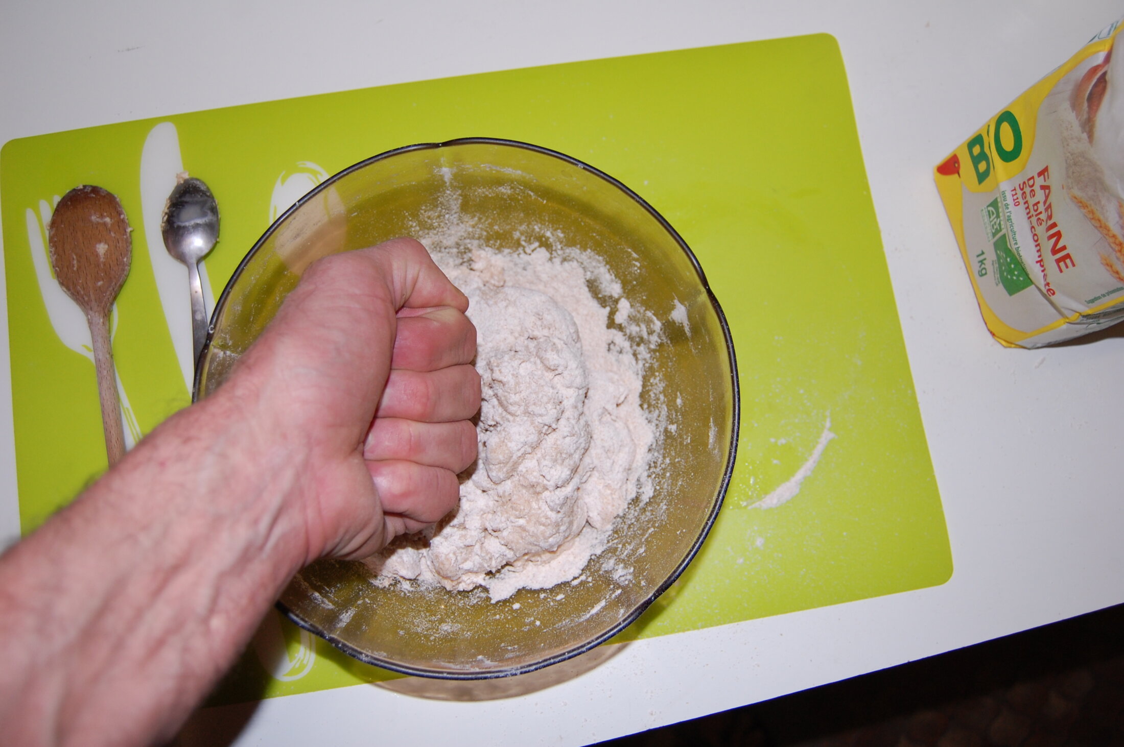 Écrasez, avec le poing, écrasez partout avec un mouvement latéral en tournant le long de la paroi, écrasez parfois au milieu. Avec l’autre main, faites tourner le saladier pour que vous soyez toujours en train de pétrir avec la même position. Ajoutez de la farine si c’est trop liquide et que ça accroche. Cette action d’ajouter a deux fonctions : elle conduit au bon dosage, et empêche l’accrochage. Retournez la pâte quand c’est faisable, et continuer votre écrasement rotatif de l’autre côté.