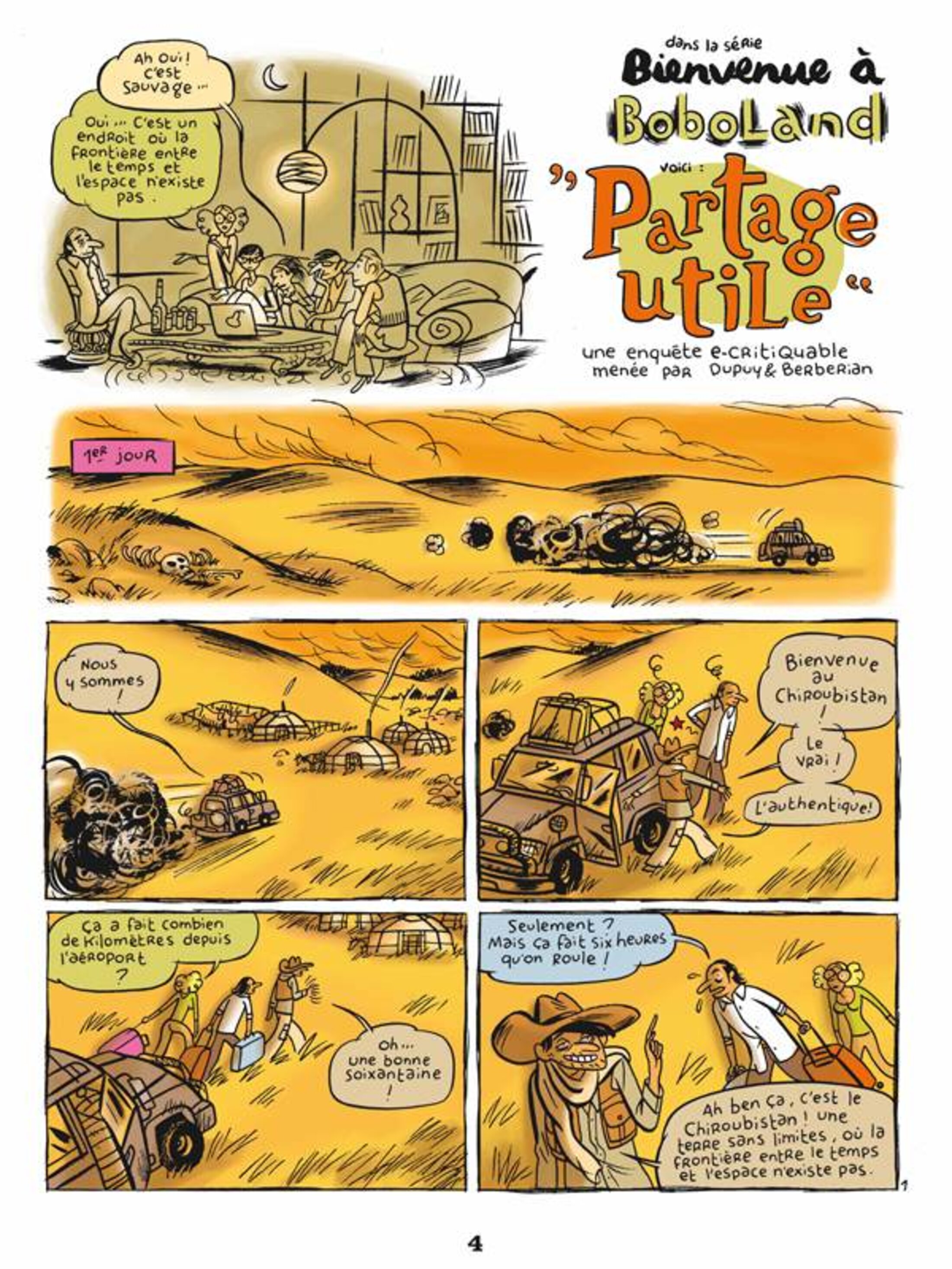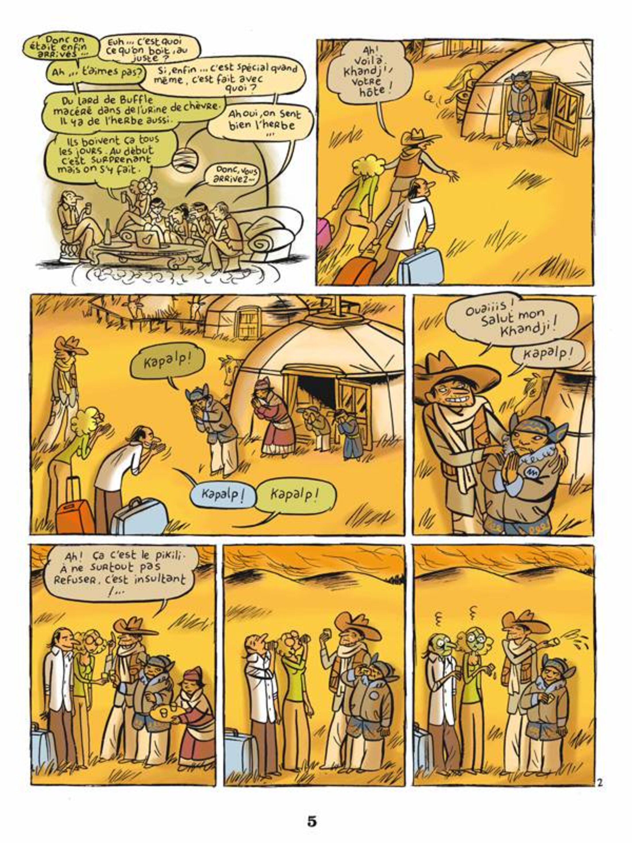 Vous l’aurez compris, Dupuy et Berberian reviennent, et ils mettent le paquet. Ils sortent des frontières, dépassent le petit monde autocentré des bobos parisiens et s’attaquent à la mondialisation. Parce que l’époque est ainsi. L’homme d’aujourd’hui vénére son téléphone mobile et l’homme de demain est un Manawah*. Le commerce n’est pas si équitable et la vie encore moins. Les grands de ce monde s’aident et s’entraident, se financent, se dédouanent, se financent encore. Et les bobos continuent de vouloir glaner un peu d’authenticité en partant trekker vrai et contribuer au développement durable au Chiroubistan, pour mieux se rabattre sur la mal bouffe au retour. Parce que bon…