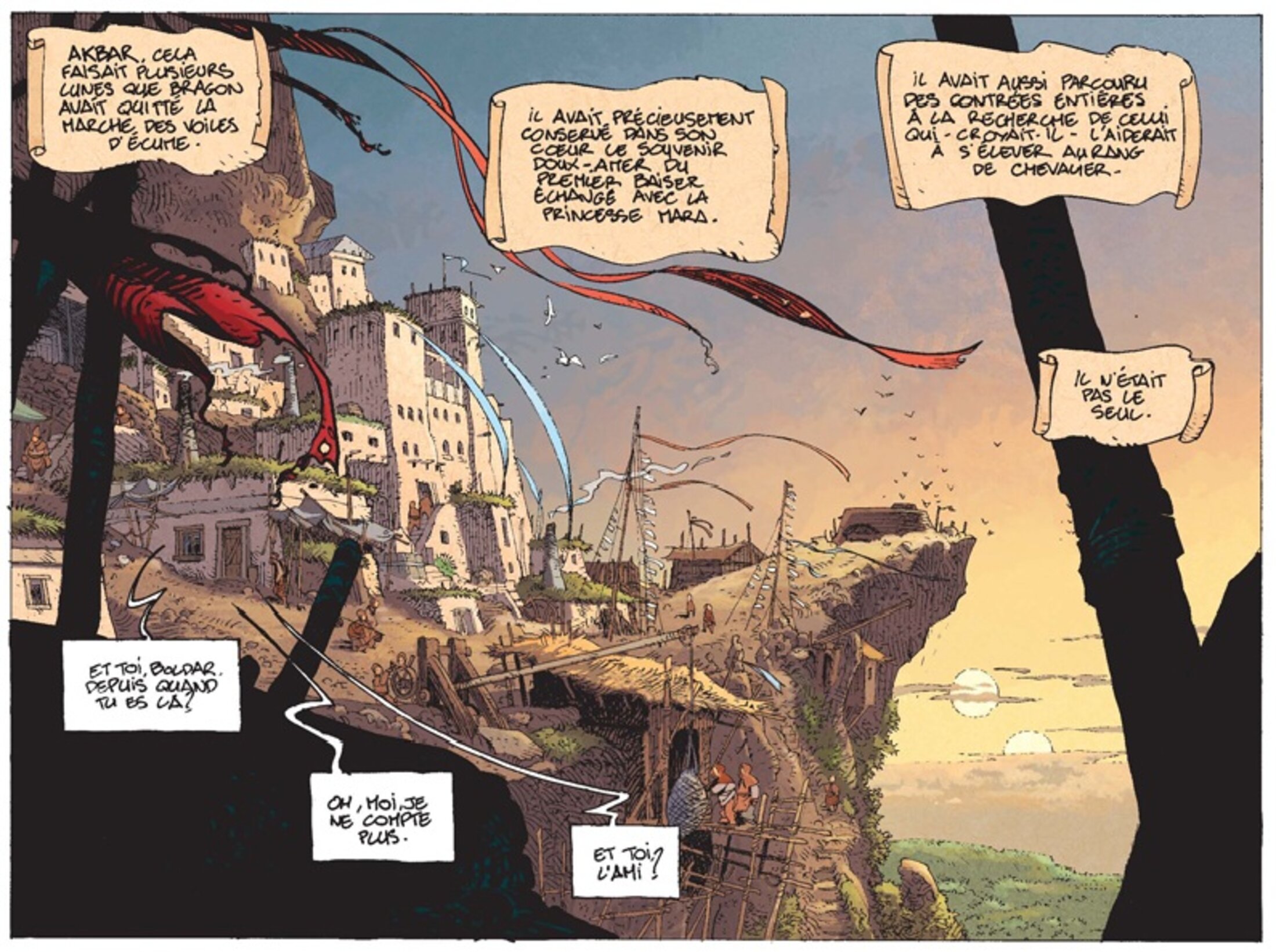 Vincent Mallié, lui, pour cette première collaboration avec les créateurs a quitté l’univers de la Science Fiction pour celui de l’Heroic Fantasy. Après Les Aquanautes, L’Arche et Le Grand Mort (avec Régis Loisel, déjà), ce jeune dessinateur a pris la suite de Lidwine et Aouamri.