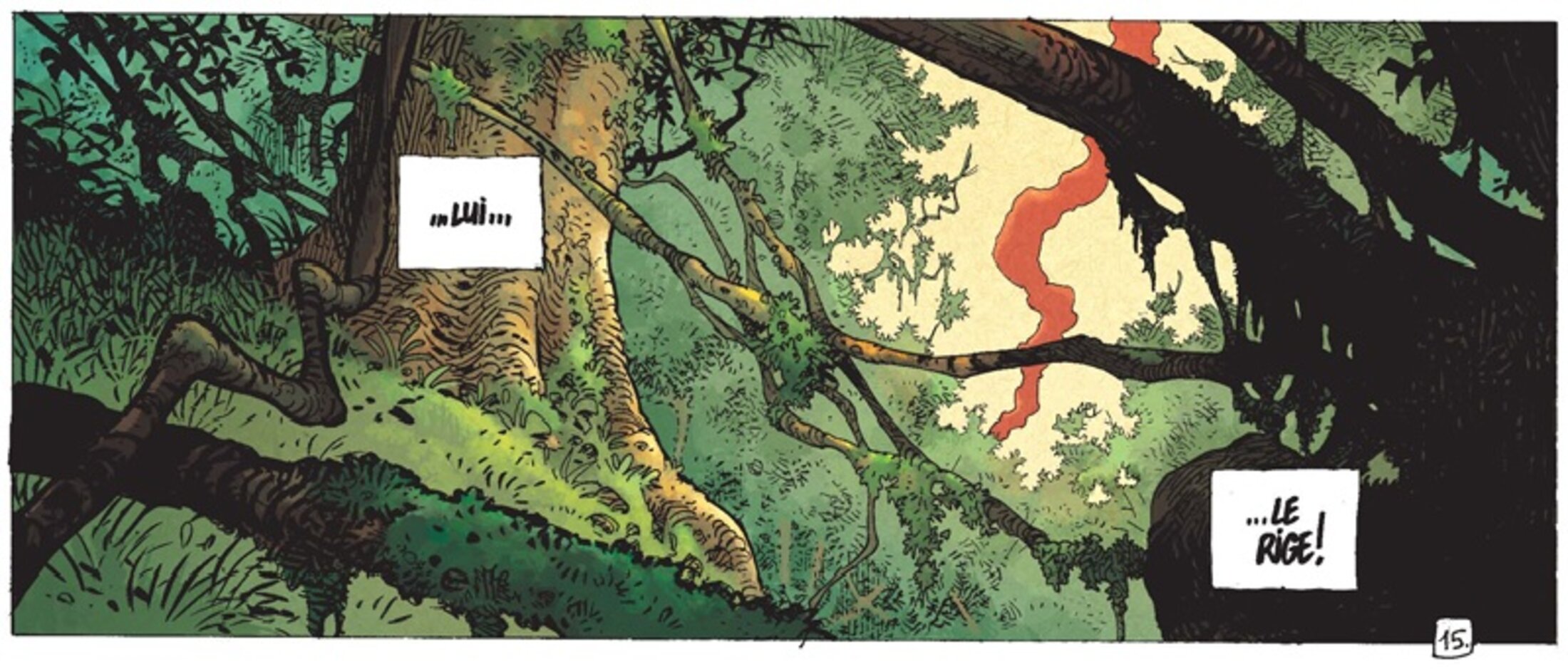 Vincent Mallié : je me souviens, quand je recevais le scénario, j’étais dans la position du premier lecteur en fait. Je découvre l’histoire, j’ai des images qui commencent à venir. Ou pas. Il y a des émotions qui naissent à cette première lecture. Personnellement, je trouve que Régis et Serge amènent extrêmement bien l’arrivée du Rige. D’emblée, on sait qu’on va découvrir le Rige dans ce tome, et on cherche moins à savoir quand il va arriver que comment. De quelle manière. Graphiquement, c’est un jeu de piste : on commence à la lisière d’une forêt, on y entre, il y a une bataille, la force des auteurs c’est d’arriver à faire oublier que le Rige va arriver. Il y a un timing et un crescendo qui est très bon en termes de narration et de suspense.