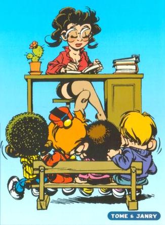 Mademoiselle Chiffre (Claudia, l’institutrice de calcul, NDR) ! Mais pour des raisons très personnelles, parce que quelque part, je peux m’amuser, et dessiner une belle femme. C’est inavouable… Mais en même temps, je ne dessine pas pour moi, je dessine pour les gens. Je trouve que parmi les dessinateurs, très peu dessinent des femmes différemment. On parlait de Franquin, il était un des rares à dessiner des femmes dissemblables. Mademoiselle Jeanne, la standardiste… Falbala à côté d’Obélix, on voit qu’il y a quelque chose qui ne marche pas. Avec Mademoiselle Chiffre, ou avec la maman de Spirou, j’ai essayé de faire en sorte qu’elles soient différentes… mais bon… j’avoue… (Janry est hilare)