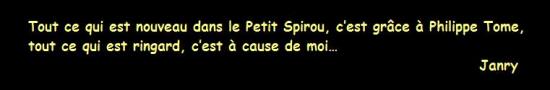 Parfois je nous accuse de le tirer dans plusieurs sens, d’en faire ce que nous voulons. Philippe est très tourné vers l’évolution, vers la prise directe avec le monde actuel, moi j’aurais tendance à vouloir qu’il reste le même, qu’il reste le même copain du début. En fait, c’est le mélange de deux personnes : Tome et Janry. Tout ce qui est nouveau dans le Petit Spirou, c’est grâce à Philippe, tout ce qui est ringard, c’est à cause de moi… (Rires, avec un clin d’œil en prime).
