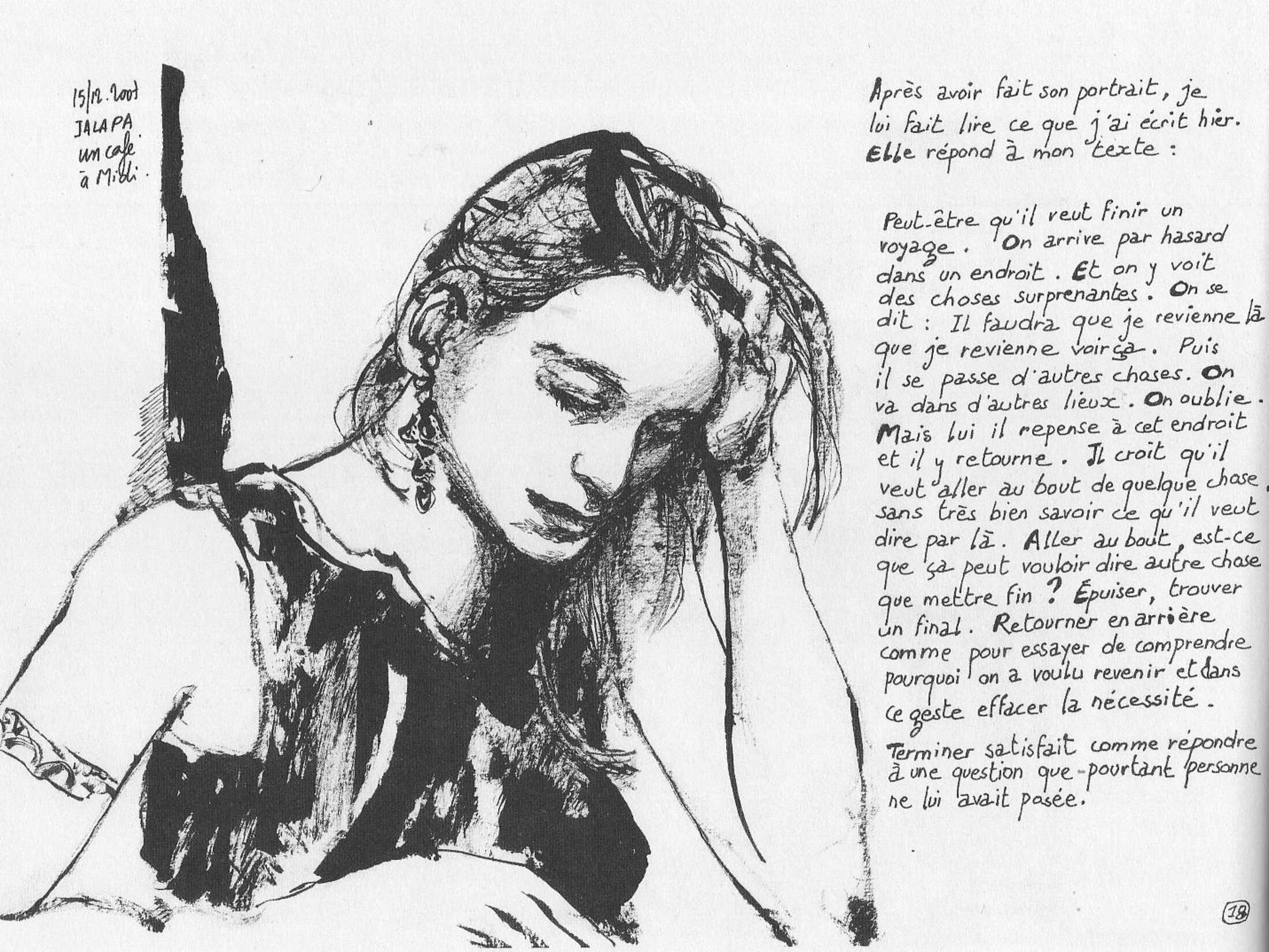Cette fois, Baudoin emporte le lecteur au Mexique dans le petit village d’Amatlan, auprès de la rivière où la mythologie mexicaine place la naissance du Dieu Quetzalcóatl, le serpent à plume. Et tout comme ce fameux dieu, le style du livre s’autorise à planer parfois comme un aigle, mais sans jamais oublier de se tenir fermement au sol, comme le serpent. Ainsi que tout voyage authentique, c’est aussi une histoire d’amour. Il y a Neige, qui écrit, et qui s’en va plus d’une fois « les poings serrés dans les poches crevées. » Neige dont le prénom m’évoque Robert Walser, et qui semble tracer sa poésie sous le soleil mexicain dans les sillons du grand Beckett. La beauté de cet amour laisse le lecteur pantois, d’autant plus que Baudoin avoue : « C’est dérisoire et un peu triste que d’essayer de peindre ou de dire la beauté. » Malgré l’aspect dérisoire de la tentative, elle existe, et nous nous réjouissons d’avoir ces pages tracées à l’encre de chine entre les mains. A plus d’un moment on a l’impression d’une partition à quatre mains. Neige introduit un personnage du nom d’Altimanale. Tout en paraissant au premier abord un personnage de fiction, cette création porte la charge tragique du livre, et devient comme un miroir. Qu’elle place ce personnage en Grèce, parait presque logique. De l’arène mexicaine à l’amphithéâtre hellène le pas se franchit si rapidement… Altimanale marche, les personnages dansent, ou ne dansent plus, et dansent encore. Les flux et reflux de l’intime nous parlent de l’éphémère, et comme en ombre portée du rire encore possible de l’autre côté de l’abolition qu’incarne Altimanale.
