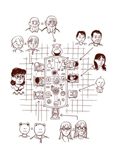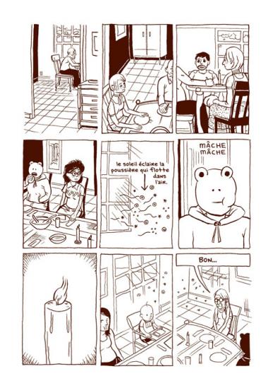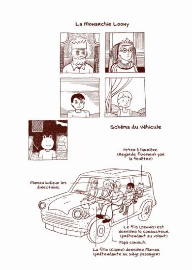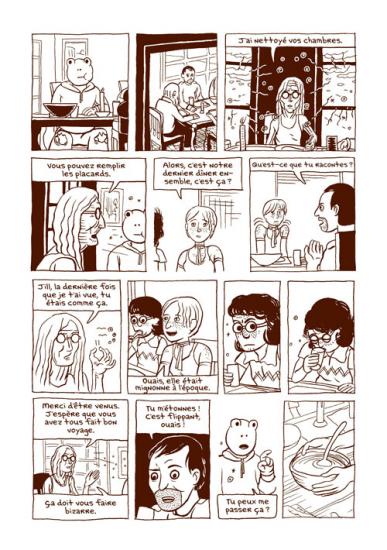 Ce que nous livre alors Dash Shaw, c’est un théâtre à plusieurs personnages. Avec des saynètes multiples. Dialogues incessants ou moments de silence à peine évités. Nous suivons la quête de chacun des enfants Loony face à l’annonce du divorce des parents. Dennis est en proie à ses angoisses présentes. Claire affronte un peu de son passé, en même temps que sa fille ira se confronter au sien et à celui de sa famille, semblant emprunter les mêmes traces que sa mère. Peter veut envisager son futur, un autre avenir, qui ne le ferait pas stagner dans cette sorte de nihilisme baba cool et ridicule qui semble le caractériser. D’autant qu’il ressemble étrangement à une grenouille…