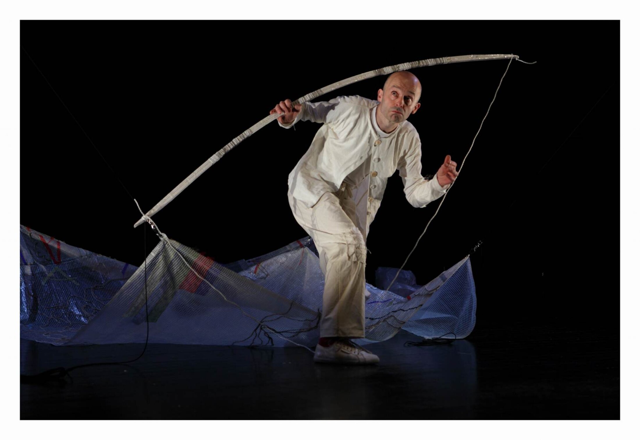 Le jeune metteur en scène Nicolas Saelens est entouré d’une équipe qui aide chacun à constituer son propre langage, un langage personnel où le poétique touche aux vérités concrètes de nos existences, l’enfermement, les croyances, les étapes de l’existence, l’ignorance, la peur... Autour d’un noyau stable de collaborateurs, l’inspiration inter-agit puissamment, en tout cas, avec audace ; c’est ludique et pertinent à la fois, impertinent, en quelque sorte, de manière à être entendu par le public le plus mixte et le plus large possible ; et le pari est réussi en tissant progressivement les éléments de l’ensemble à offrir. Quand il manque un mot, juste un mot au comédien Philippe Rodriguez-Jorda, l’auteur Kossi Éfoui fournit deux jours plus tard un catalogue où l’acteur puisera l’impulsion qui manquait à son rythme sur scène. Quand le texte apparaît trop abstrait, fuyant, insaisissable, la musicienne Karine Dumont va dynamiser la partie de partition sur laquelle la comédienne Angeline Bouille ouvrira de nouveaux cadres en soufflant les repères où s’enfermait, avec le personnage, l’équipe entière ; et les repères ne sautent qu’avec la connivence de tous, ou de chacun, ce qui revient au même, car ça repose, à la fraction de seconde près, aux effet de régie par la grâce d’Hervé Recorbet à la lumière, lequel peut même transformer des lancers de confettis comme autant de feux d’artifice. Quant au travail sur les objets, la matière, le tissu, le vent lui-même, on comprend qu’il provient d’un art sans cesse renouvelé de la marionnette, c’est-à-dire de transformation sous forme humaine, parlante, ouverte, joueuse : que serait ici la plastique sans le plasticien Norbert Choquet et la costumière Marie Ampe par lesquels tout commence, en donnant vie à un simple ectoplasme ? On ne se le demande même pas.