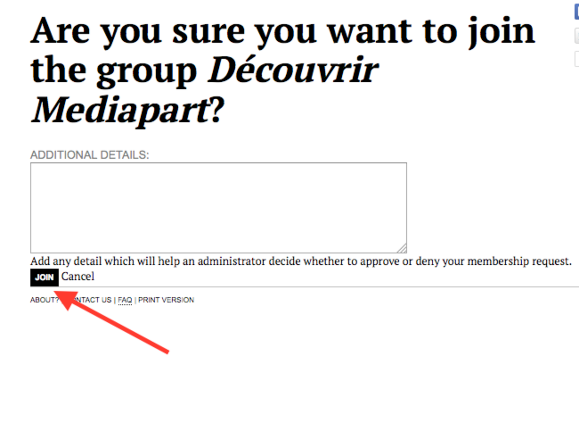 • Sur la page suivante, vous avez la possibilité d'écrire un petit texte afin d'argumenter votre demande. Cliquez ensuite sur "Join" :
