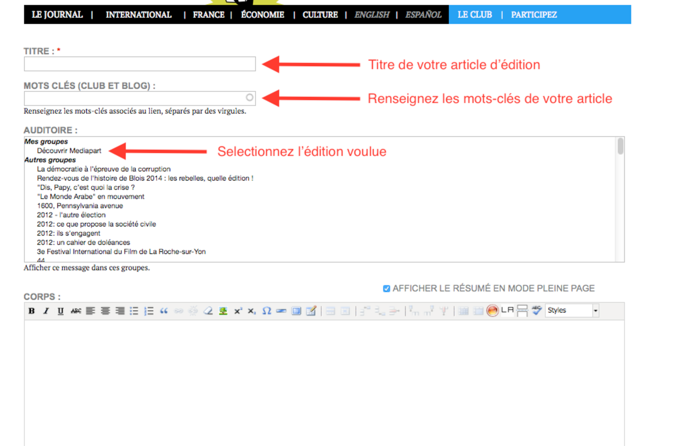 • Sur la page suivante vous pouvez rédiger votre article d'édition :