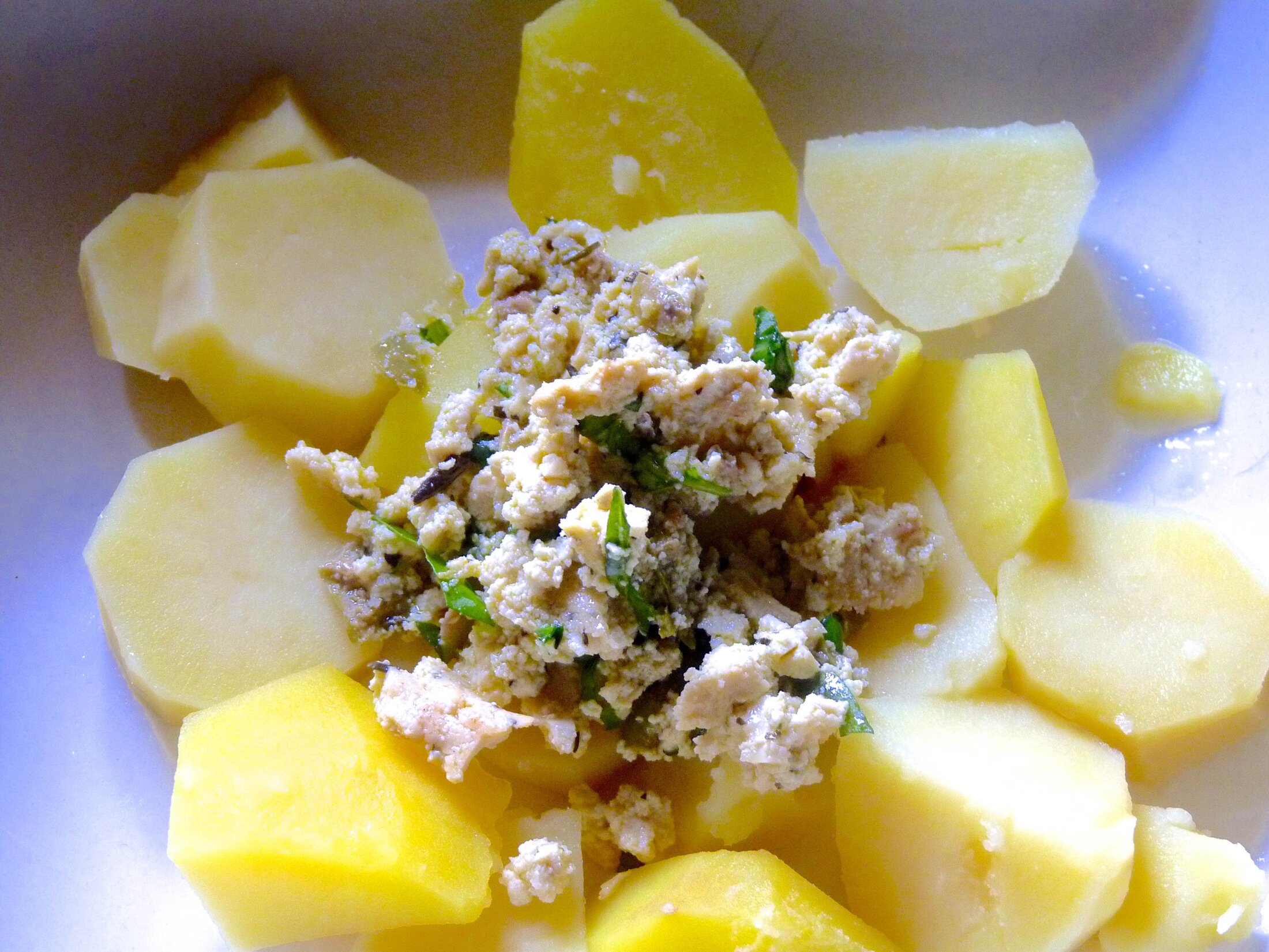 Faire cuire les pommes de terre à la vapeur. Pendant ce temps, écraser à la fourchette du tofu aux olives (taifun, le meilleur!), pour en faire un "mimosa" (cf les oeufs mimosa ), et lui ajouter sel poivre, basilic ciselé et assez d'huile d'olive pour que ça fasse une bonne sauce aux patates!