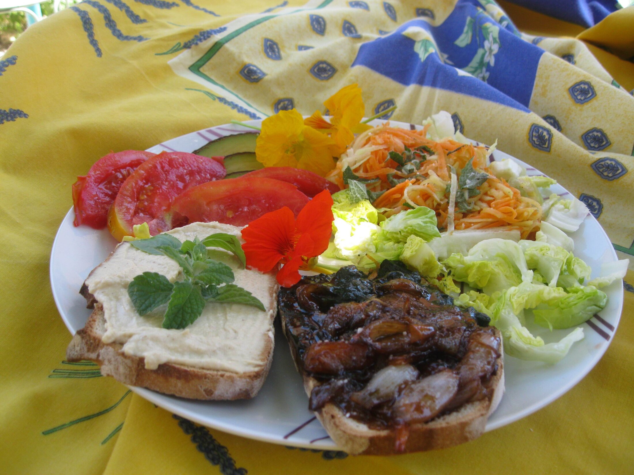 Pour ma part, dans mon assiette, je rajoute une tartine d'houmous selon l'excellente recette de Maui, quelques tranches de tomates des jardins du pays d'Aubagne, un peu d'avocat, des cœurs de salade du jardin, un mini celeri-rave râpé avec des carottes, quelques feuilles de basilic et de menthe, et voilà la plus jolie composition d'une assiette de dimanche à midi ! Et avec toutes les vitamines pour redémarrer une semaine !