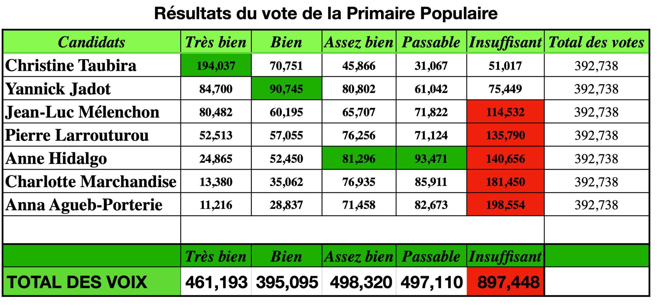 Christine Taubira est effectivement arrivée première sur sept candidats dans la catégorie « Très Bien », et deuxième dans la catégorie « Bien » mais elle est complètement rejetée par les autres électeurs qui la relèguent à la dernière place dans les catégories « Assez Bien » et « Passable ».