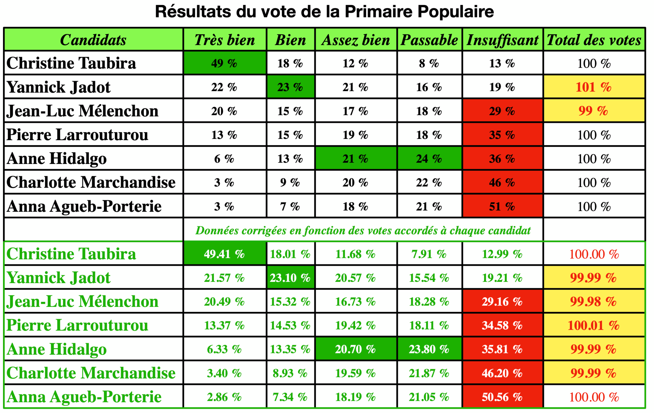 Ainsi si l’on reprend cette meme méthode pour les résultats déjà acquis par la Primaire populaire lors du vote du 27 au 30 janvier janvier 2022, on trouve d’ailleurs un résultat totalement différent.