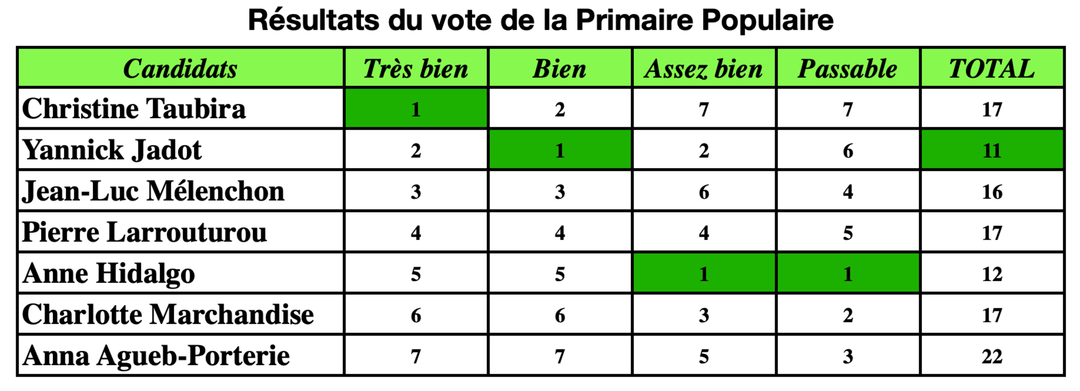 A bien regarder ce tableau, Yannick Jadot se révèle le véritable vainqueur de la Primaire Populaire. Et un second tour l’aurait probablement confirmé.