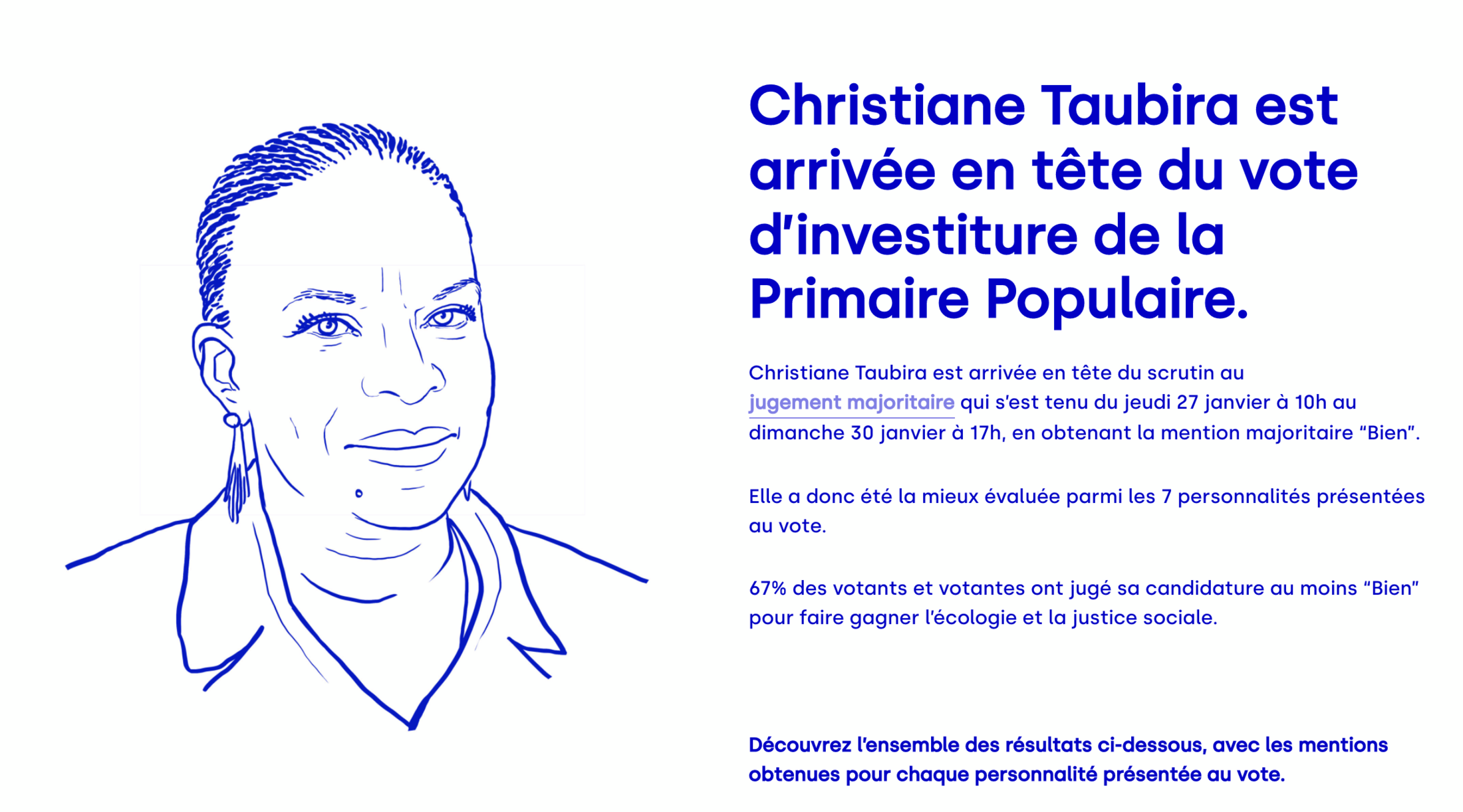 « Christine Taubira est arrivée en tête du vote d’investiture au jugement majoritaire » Voilà ce que l’on peut lire sur le site de la primaire populaire : www.primairepopulaire.fr