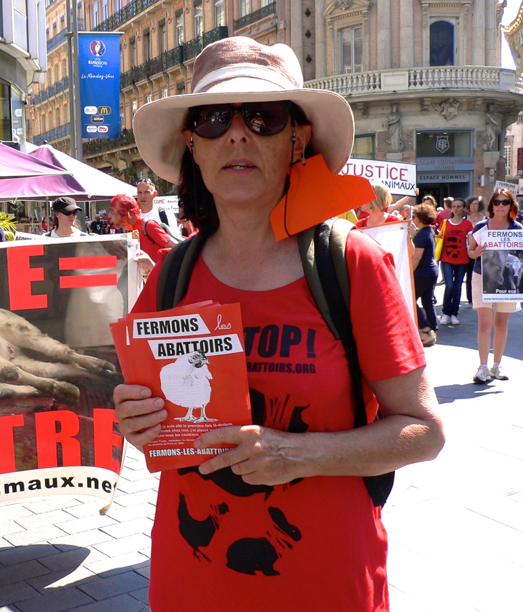 comme dans de nombreux pays, et à Paris la semaine prochaine (13 juin), nous avons marché à Toulouse pour la fermeture des abattoirs, il y avait plusieurs centaines de manifestants, quelques vues.........(on avait des boucles de marquage à l'oreille, bonne idée..............)