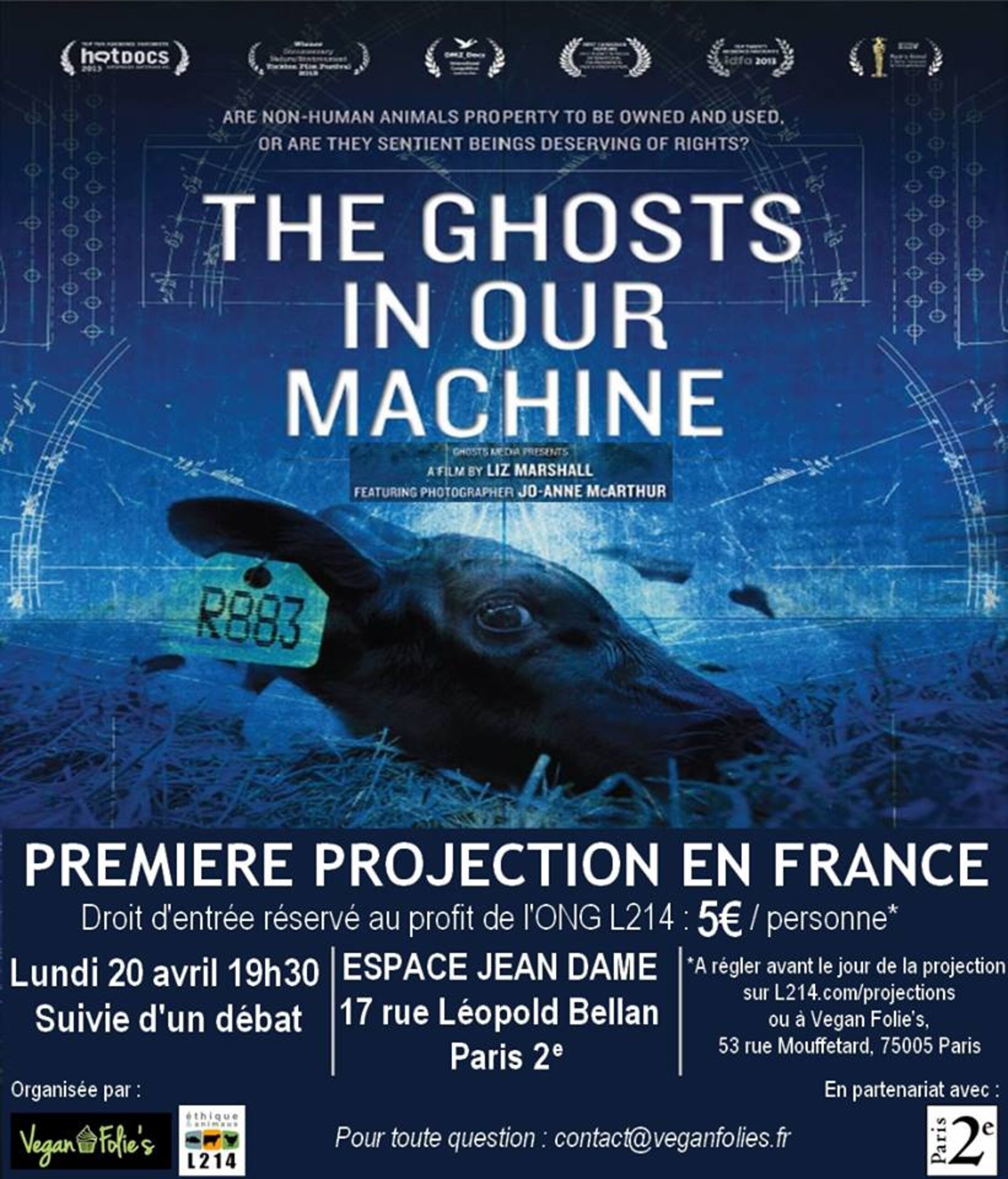 Vegan Folie’s et L214 organisent la PREMIERE projection en France de The Ghosts in our machine, documentaire cinématographique qui met en lumière la vie et la souffrance des animaux : certains sauvés de la machine de notre monde moderne et d'autres dans les élevages.