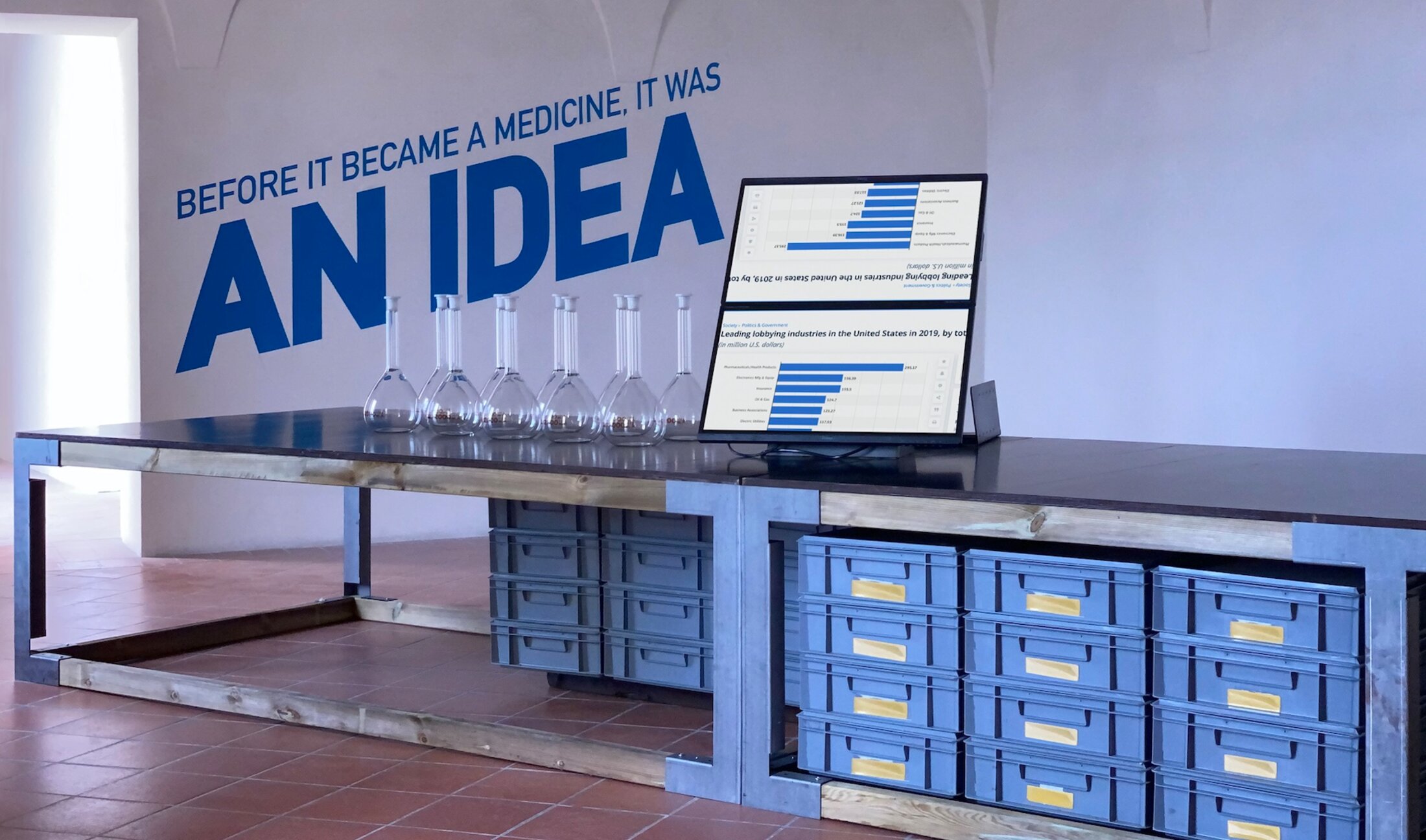 L’artiste a également repris et détourné le graphisme médical des labos et de leurs emballages. Notamment avec le slogan qu’ouvre l’exposition « before it became a medecine, it was an idea » : « avant que cela devienne une médecine cela a été une idée ». Une idée ou un concept plus commercial qu’autre chose s’entend.