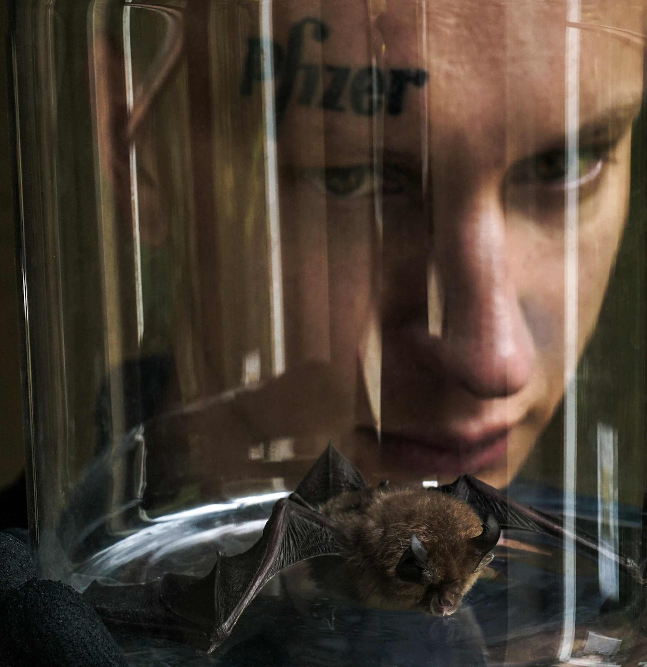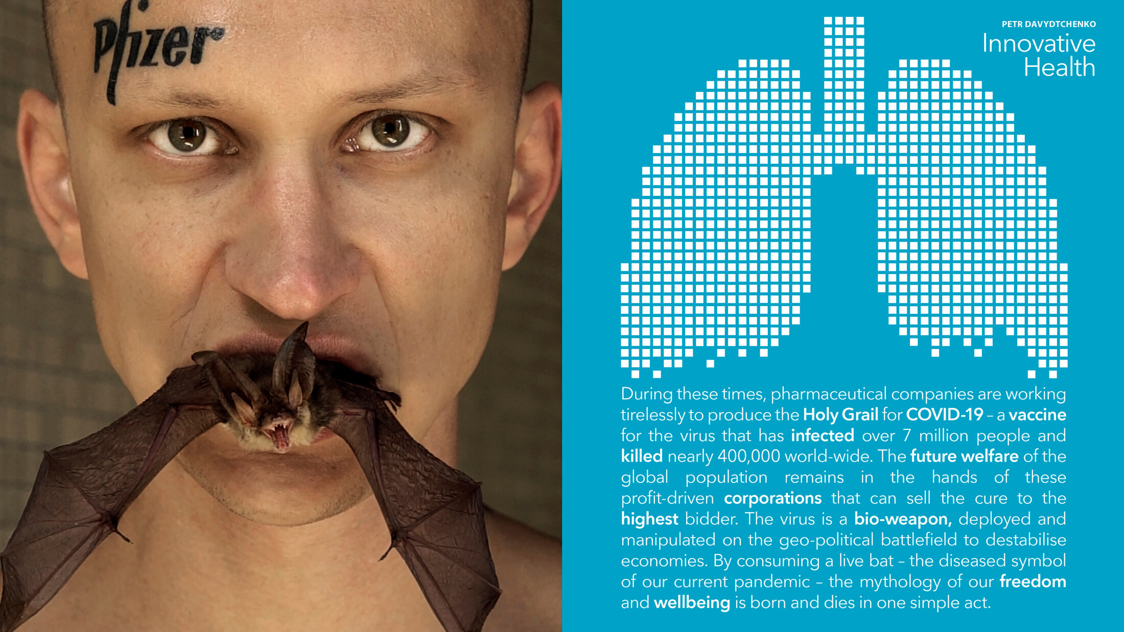 « Je mange une chauve-souris vivante pour détruire le pouvoir des grandes sociétés pharmaceutiques. En ingérant le sang de l’animal qui est devenu le symbole de l’origine du covid 19, je cherche à créer mon propre vaccin contre la maladie, et à me faire vacciner non seulement contre le coronavirus, mais contre la cupidité des entreprises régissant les actions des grands groupes pharmaceutiques. Le virus a infecté plus de 7 millions de personnes, et en tuant plus de 400 000 à travers le monde. Il a été déployé sur le champ de bataille géopolitique en tant qu’arme biologique pour déstabiliser les économies. Un vaccin est notre seul espoir. Mais alors que les sociétés pharmaceutiques travaillent sans relâche pour trouver le remède, le bien-être futur de la population mondiale reste entre les mains de ces sociétés à but lucratif qui font chanter la civilisation pour obtenir des profits d’une ampleur sans précédent. »