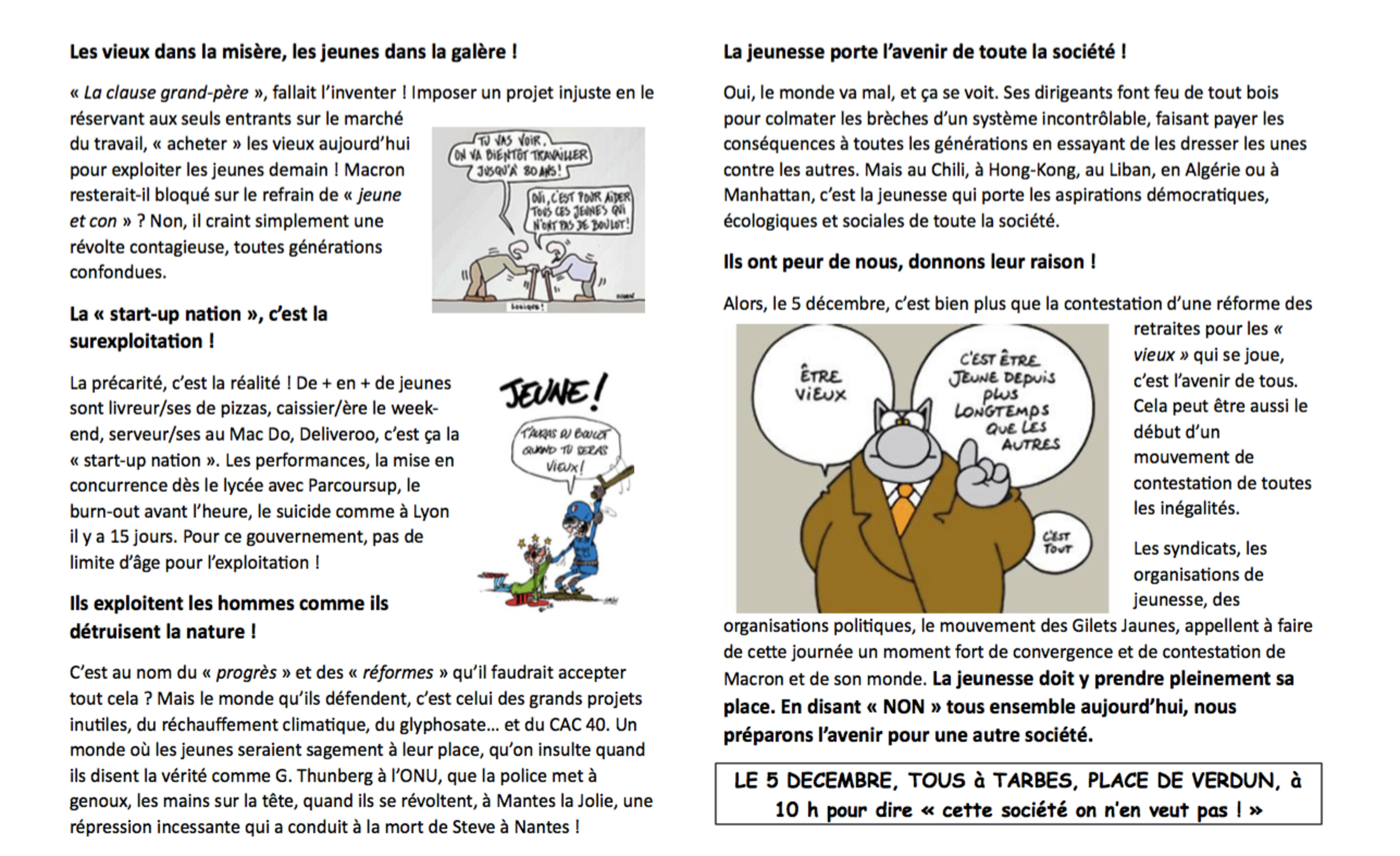 Voici aussi des tracts, puis une invitation à débat qui ont été diffusés pour les manifestations du 5 et des suivantes, visant à rassembler les différentes composantes de la société autour de ce mouvement de sorte que la division prônée par le gouvernement soit mise en évidence et ne passe pas.