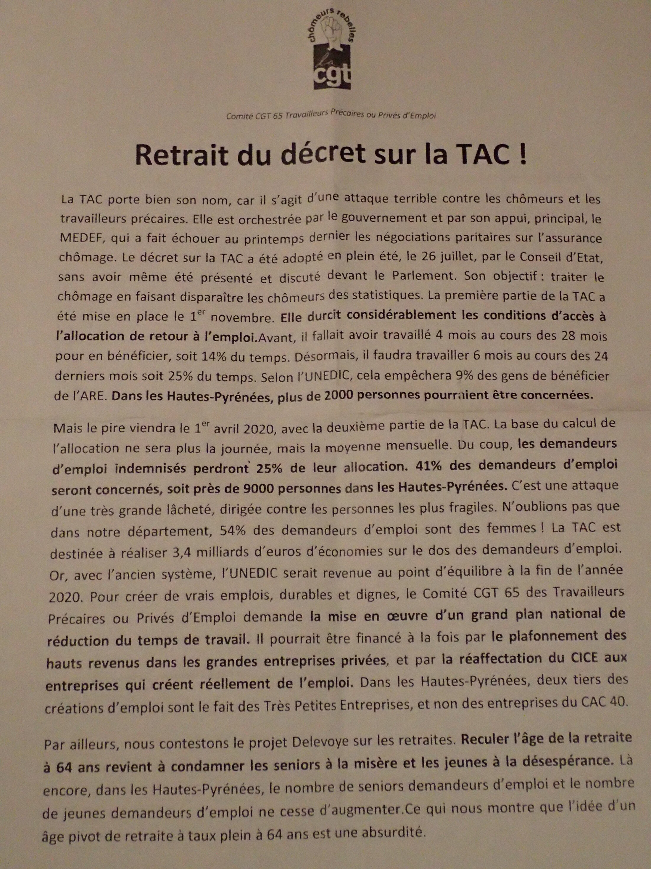 Ce changement affecte la grande majorité des demandeurs d’emploi des catégories B et C, aux petits contrats UNEDIC 3 : 9 % des demandeurs d’emploi (dont pratiquement 2000 personnes des Hautes-Pyrénées) risquent de se retrouver privés d’allocations chômage, soit 30€/jour environ. 4