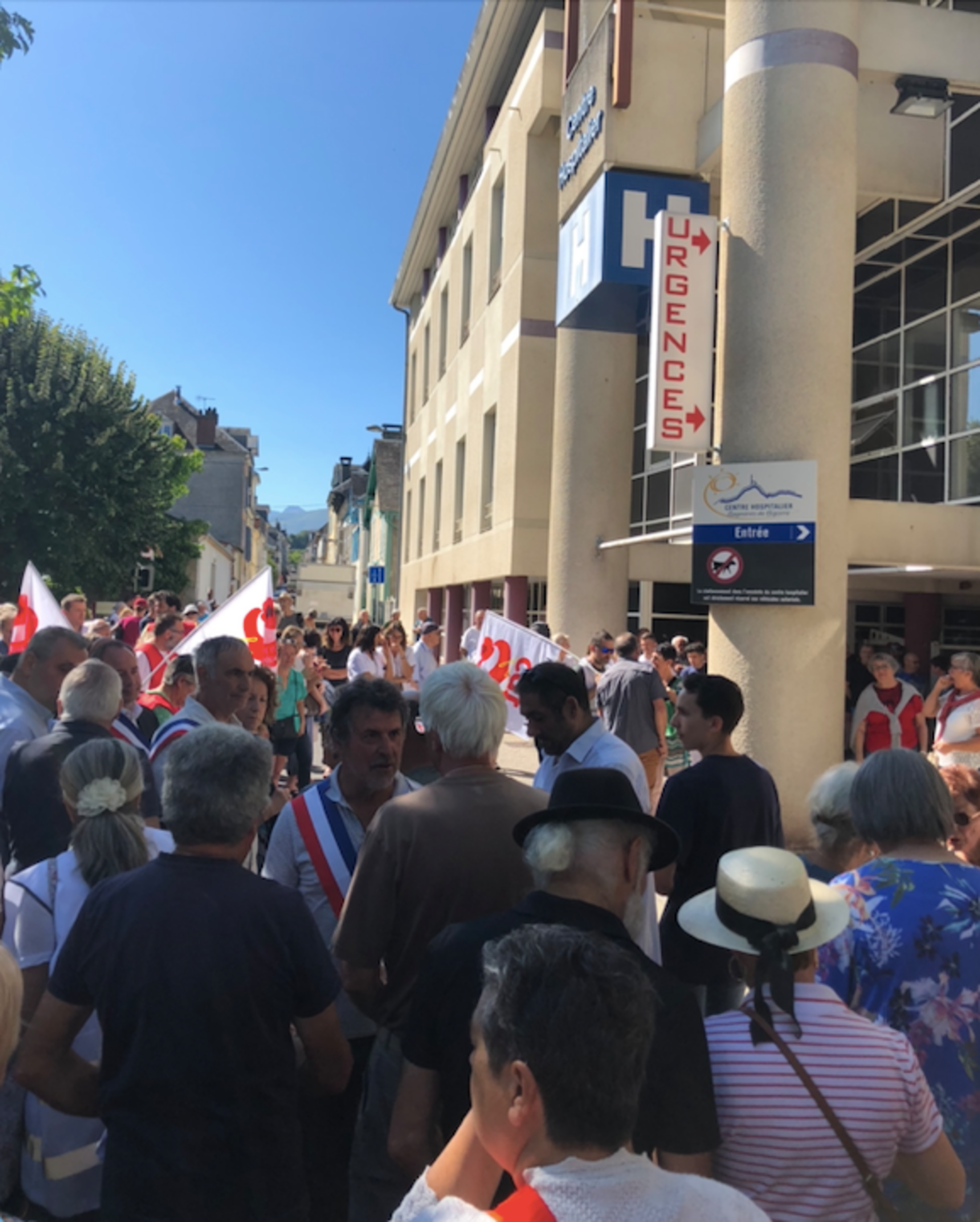 Le défilé des manifestant·e·s était impressionnant, immense, et compact, de l'hôpital à la place de Strasbourg, et des Coustous à la sous-préfecture, concentré et plutôt silencieux, laissant émerger les voix des intervenants dans les mégaphones … chacune et chacun était venu·e témoigner de son engagement pour la survie possible, dans une région montagneuse où seule la solidarité institutionnelle peut secourir quiconque, dans des conditions humaines indispensables.
