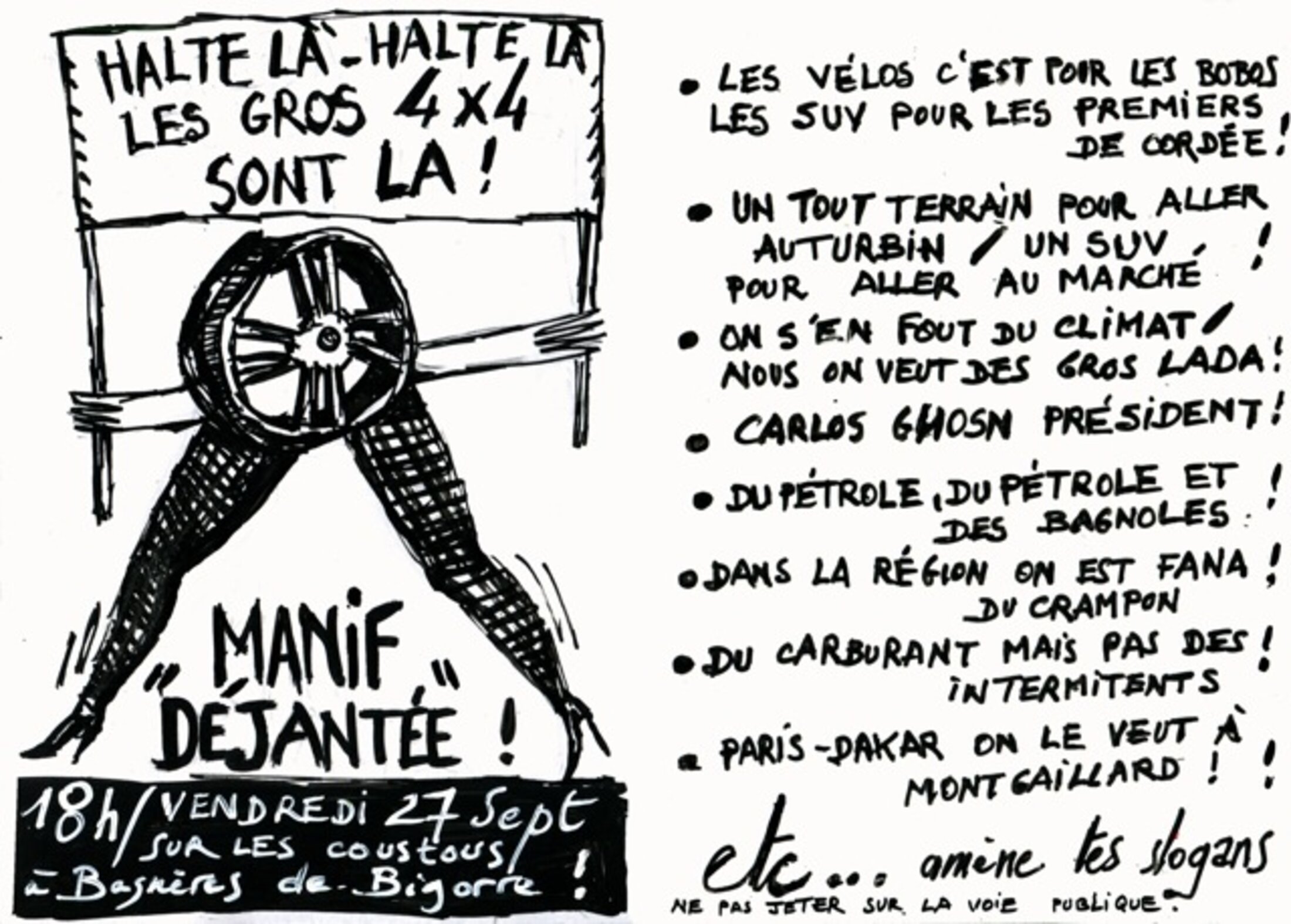 - à nous rejoindre nombreux, comme à Francfort, dans une « Manif déjantée », le vendredi 27 septembre à 18 h sur la place des Coustous à Bagnères-de-Bigorre, pour s’inviter à l’inauguration du 3e Salon off road Pyrénées. (Casseroles, petites voitures, sifflets, cors et autres pouet, pouet... autorisés)