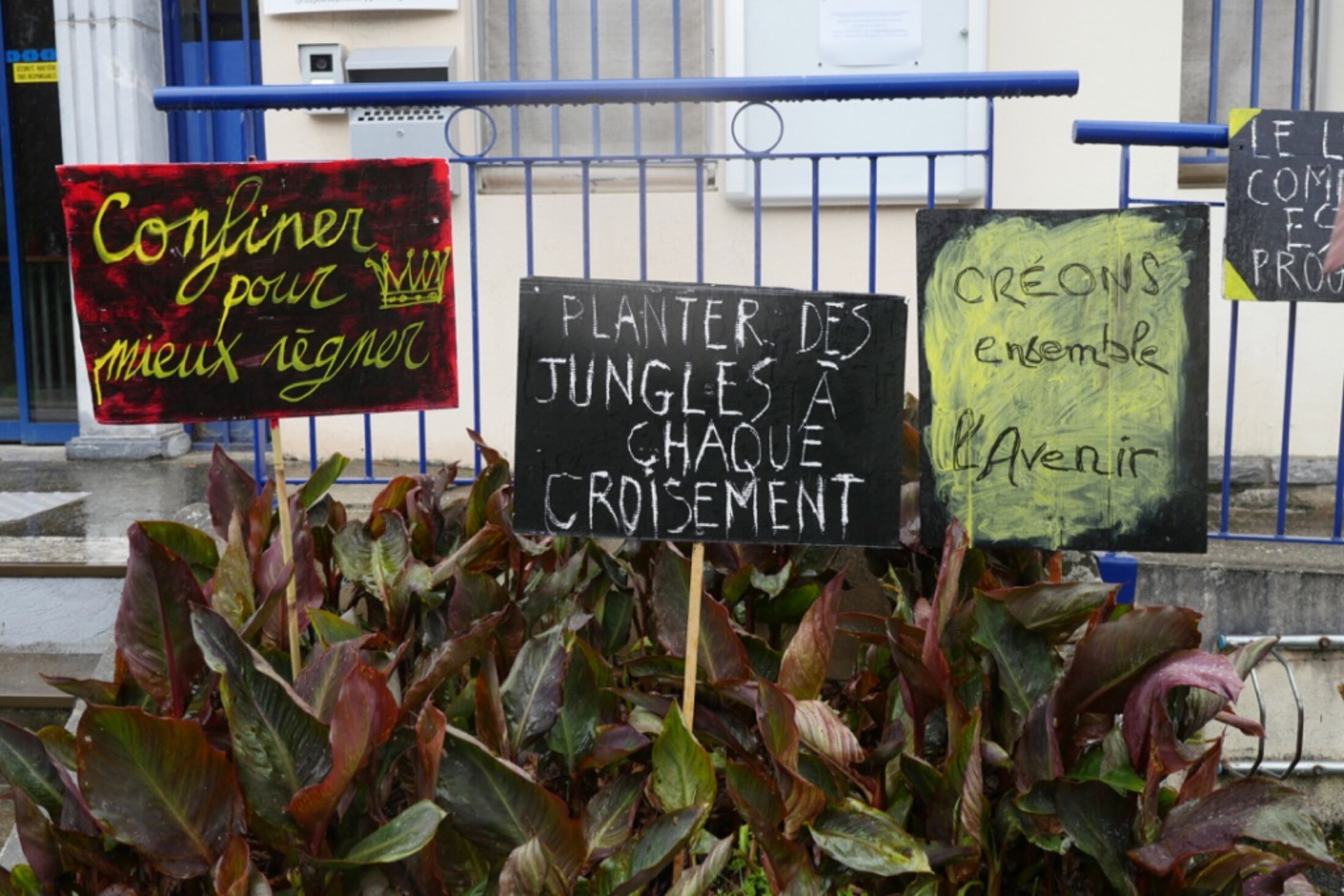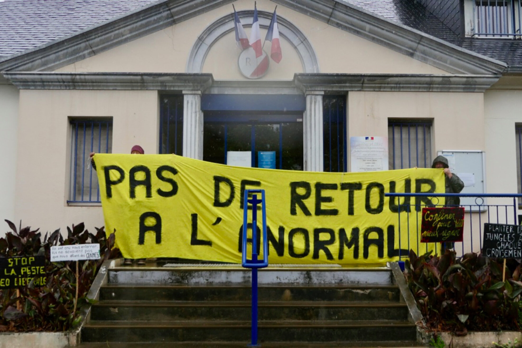 Le 11 mai de cette année 2020, premier jour de « déconfinement-post Covid 19», dix personnes participaient avec calme, devant la sous-préfecture de Bagnères-de-Bigorre, à un bref rassemblement autour d’une banderole et de pancartes indiquant leur refus d’un retour à « l’anormal ». Cet anormal que nous dénonçons est celui d’un système dévorateur de matières premières, d’espaces et d’humains, au profit des plus riches.