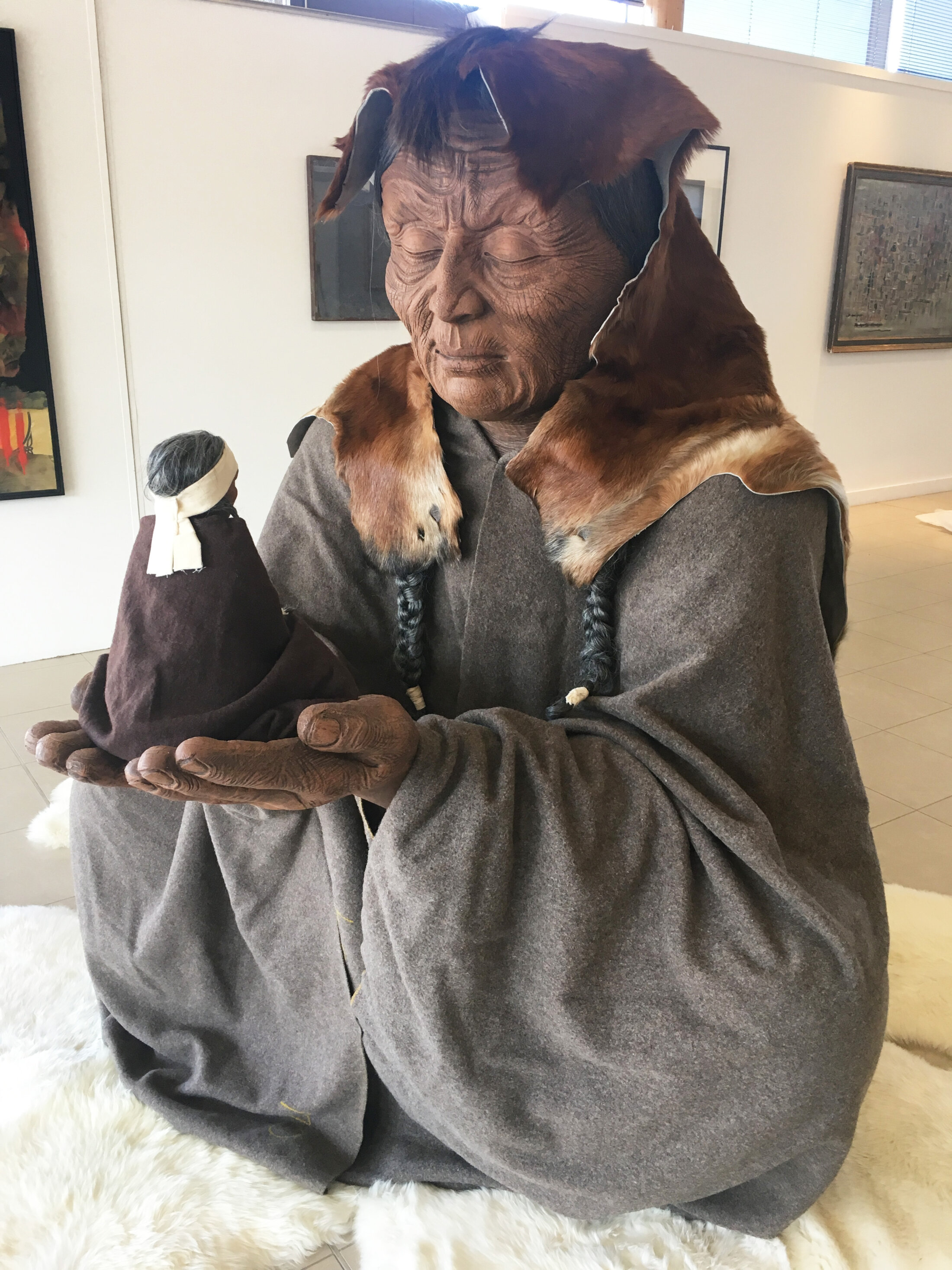 A travers l’exposition Elixirs, elle prend même une dimension supplémentaire et nouvelle dans son association avec une autre œuvre d’art contemporain qui a été placée à l’entrée de l’église. Il s’agit d’une sculpture de l’artiste française Virginie Barré, intitulée Time after Time issue de la collection du FRAC Occitanie. Elle représente une chamane amérindienne en position de méditation, les mains tendues dans lesquelles reposent sa propre effigie. Comme si la chamane était face à sa propre apparition.