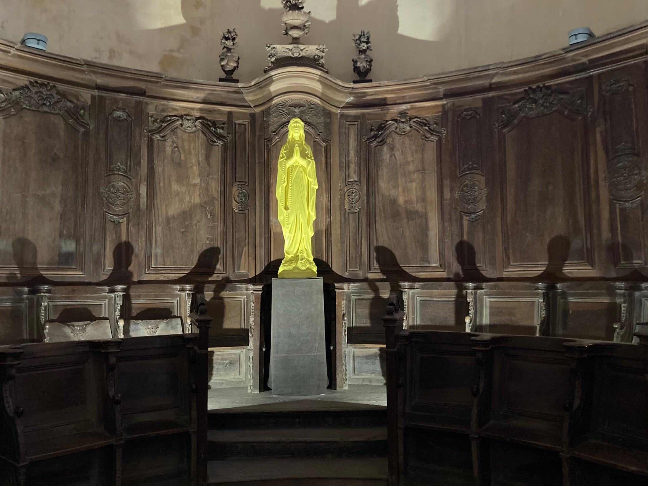 Pour cette exposition la vierge jaune a été placée dans une niche au fond de l’abside, juste derrière l’autel d’où elle rayonne sur toute l’église. Comme si elle avait toujours été là. Issue d’un bibelot acheté à Lourdes par Katarina Fristch dans les années 80, l’effigie de la vierge a été élevée au rang d’œuvre d’art en série illimitée à la manière du pop art.