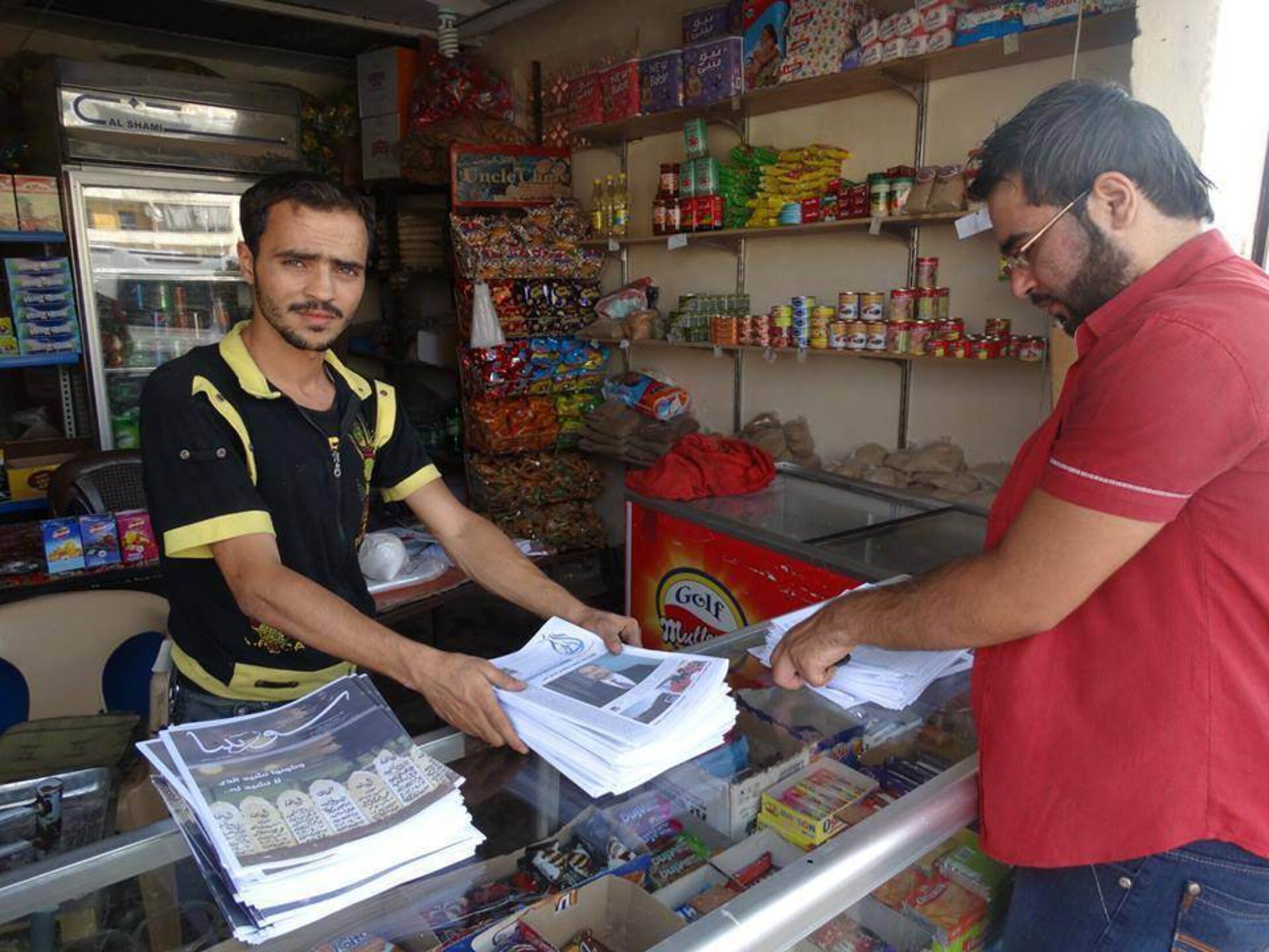 Once the drivers have successfully brought the copies of the newspapers into the various regions, they are passed on to others. “We have a media center in each of the seven regions which we use as a distribution point for the journals.” A team then takes the journals, dividing them up between groups who will distribute directly to people. “Before the crisis, there were practical newspaper kiosks and stands, but these places don’t exist any longer.” Fadi counts on local businesspeople, and organizations to partner with for distribution. “We find people or businesses which have a premises we can use, and who play a central role in their respective communities.” Fadi and his team have in a way recreated the local newspaper stand. “We allocate a certain number of copies to corner shops, medical centers, makeshift hospitals, schools, premises of teachers unions, universities, local coordination committees, and so on.” At these places, anyone can pick a free copy of the newspaper of his choice.