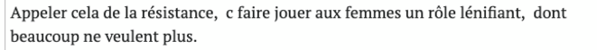 Appeler cela de la résistance, c faire jouer aux femmes un rôle lénifiant, dont beaucoup ne veulent plus.