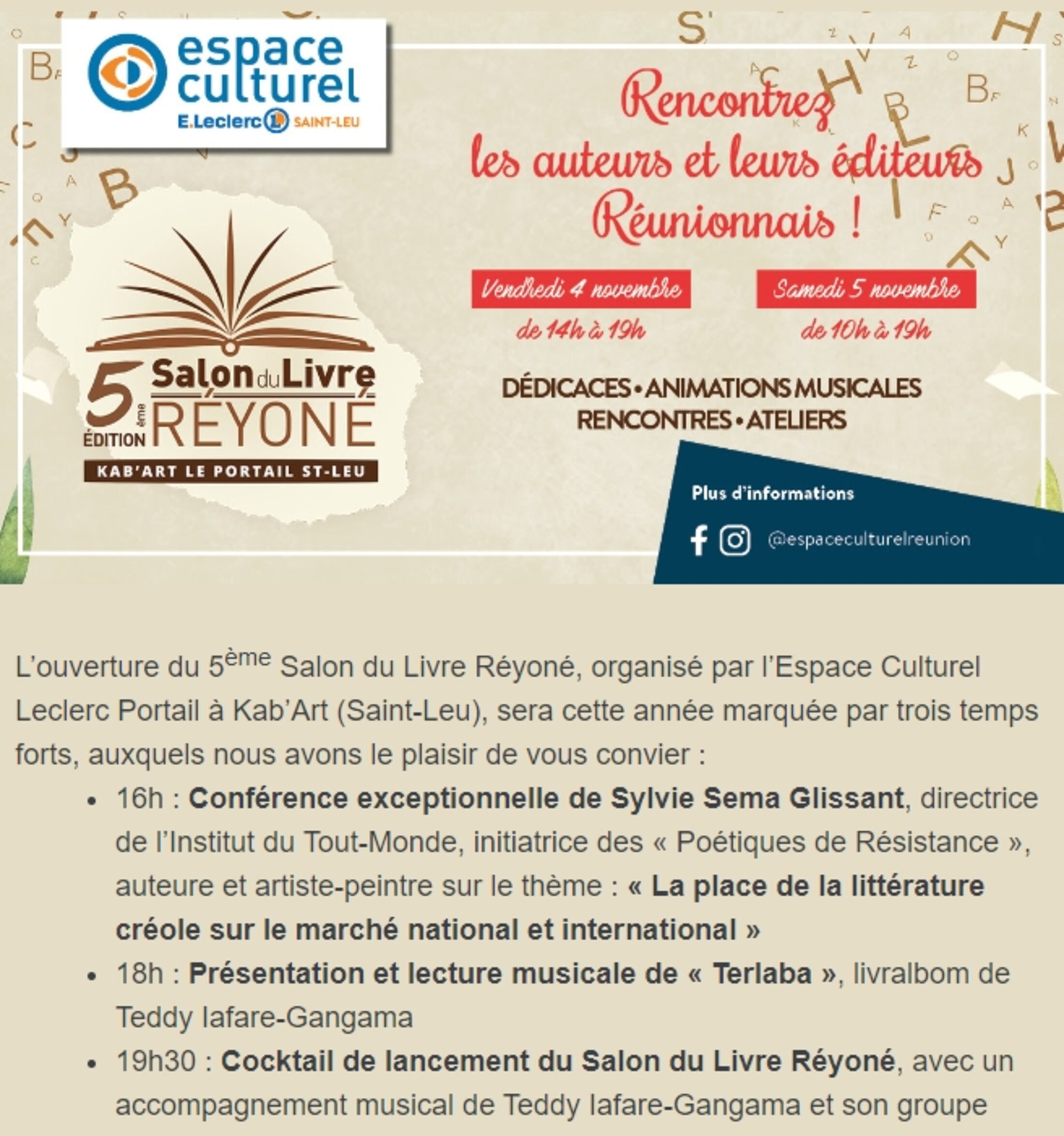 Sylvie Glissant ouvrira le 5e Salon du livre Reyoné, Saint-Leu, La Réunion, vendredi 4 novembre 2022.