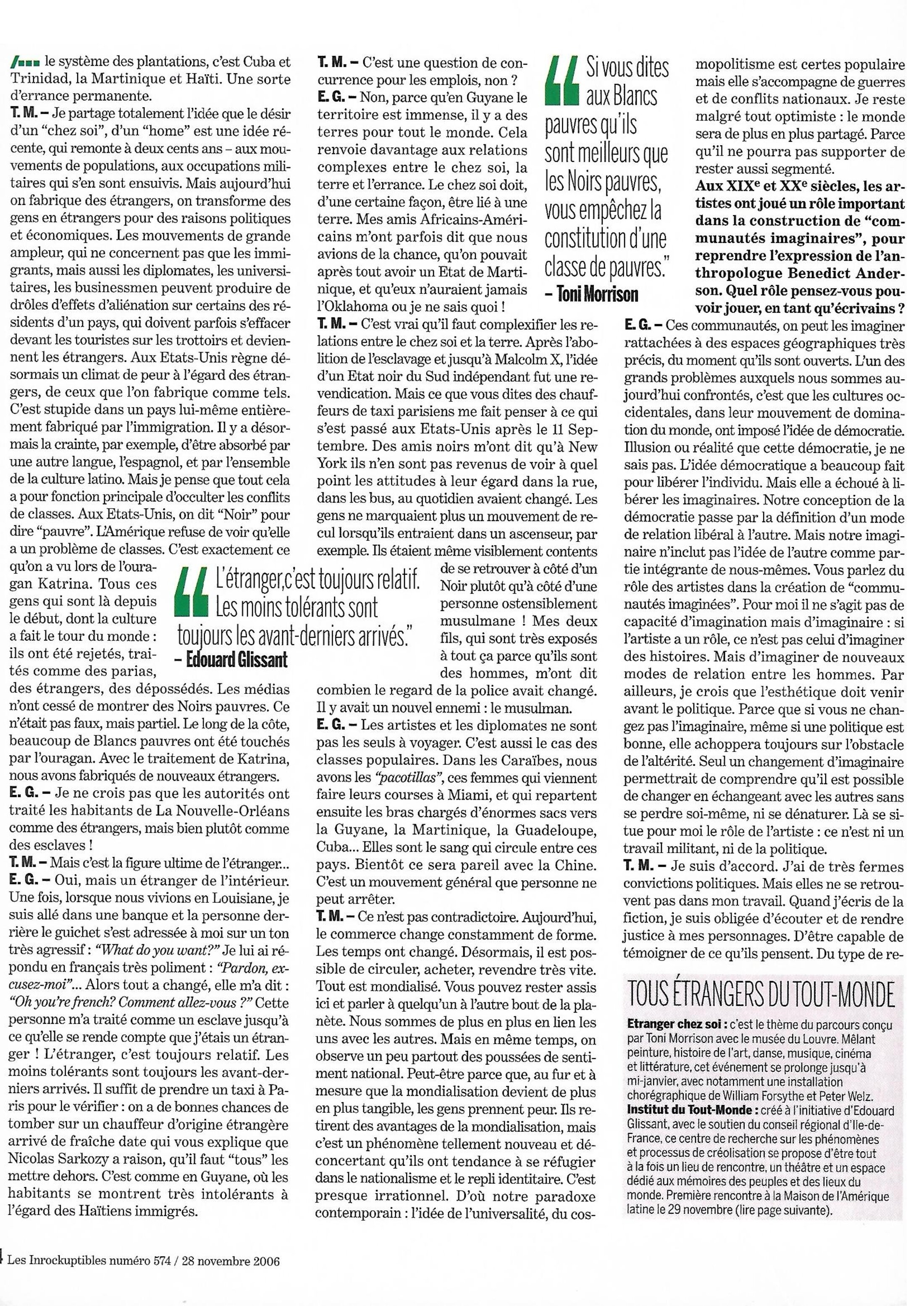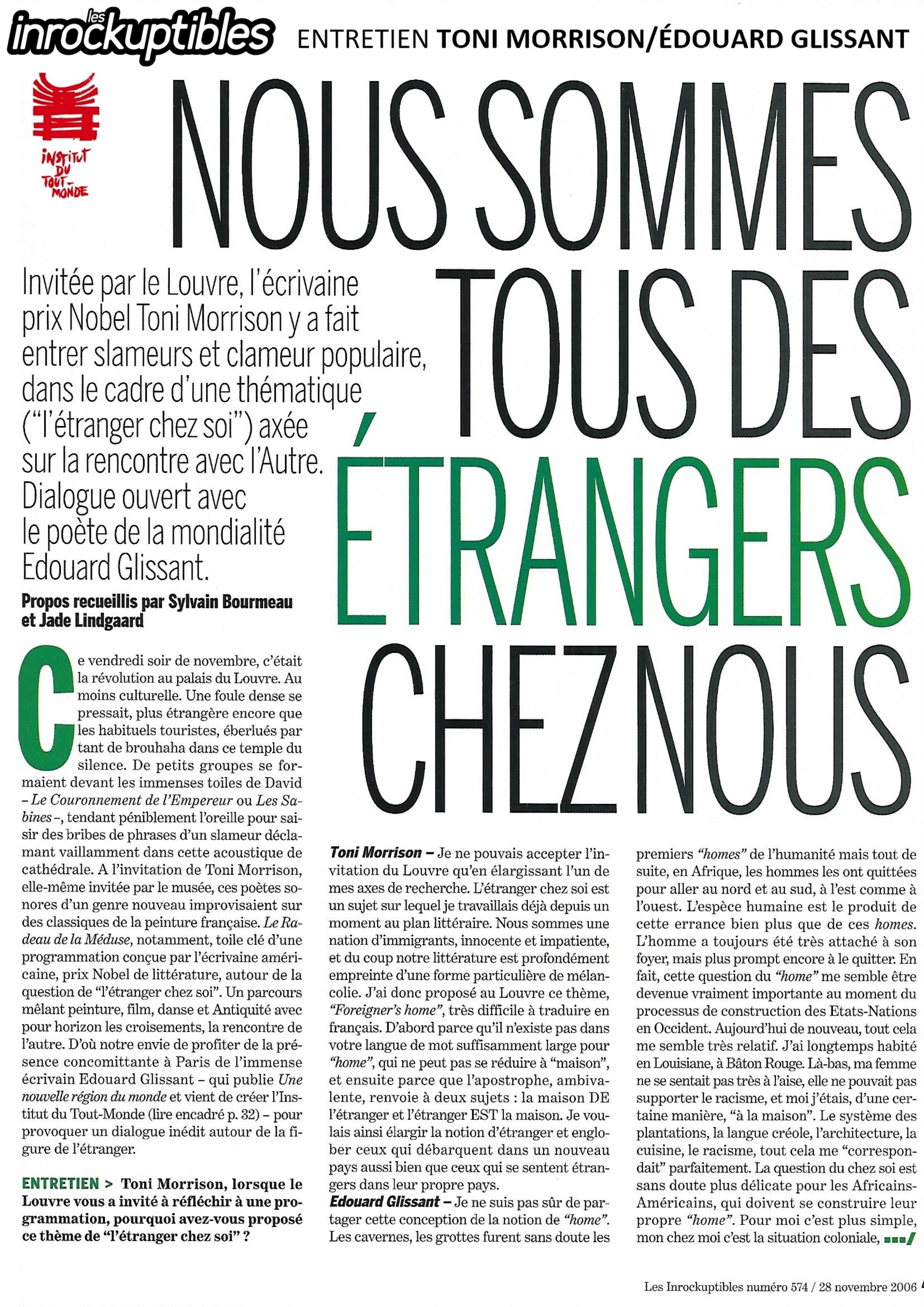 En novembre 2006, le magazine « Les Inrockuptibles » organise un entretien à Paris entre Toni Morrison et Édouard Glissant. Selon le récit des Inrockuptibles, « une immédiate complicité » s'installe entre les deux écrivains. La reconnaissance mutuelle d'une certaine conception de la littérature et d'une vision commune de l'histoire. L'ITM vous propose le texte intégral de cet entretien mémorable.
