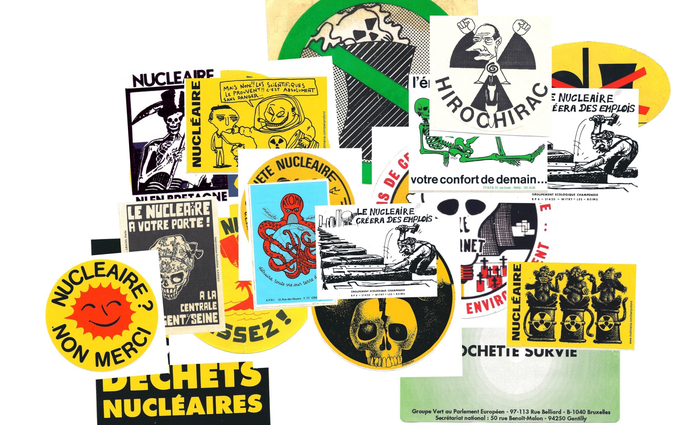 Têtes de mort, squelettes et mise en bière, ça fait si longtemps que la petite propagande de rue alerte et prévient: le nucléaire tue. Dès les années soixante-dix, de gentils chevelus à la barbe fleurie, imbibés de contre-culture, un peu niais peut-être, pacifique sûrement, autocollaient sur leurs 2CV des signaux de détresse. Parfois ronds comme des cibles, alarmistes mais souvent drôles, résistants à toutes épreuves, ces autocollants se vendaient ou se distribuaient pour soutenir la cause antinucléaire.